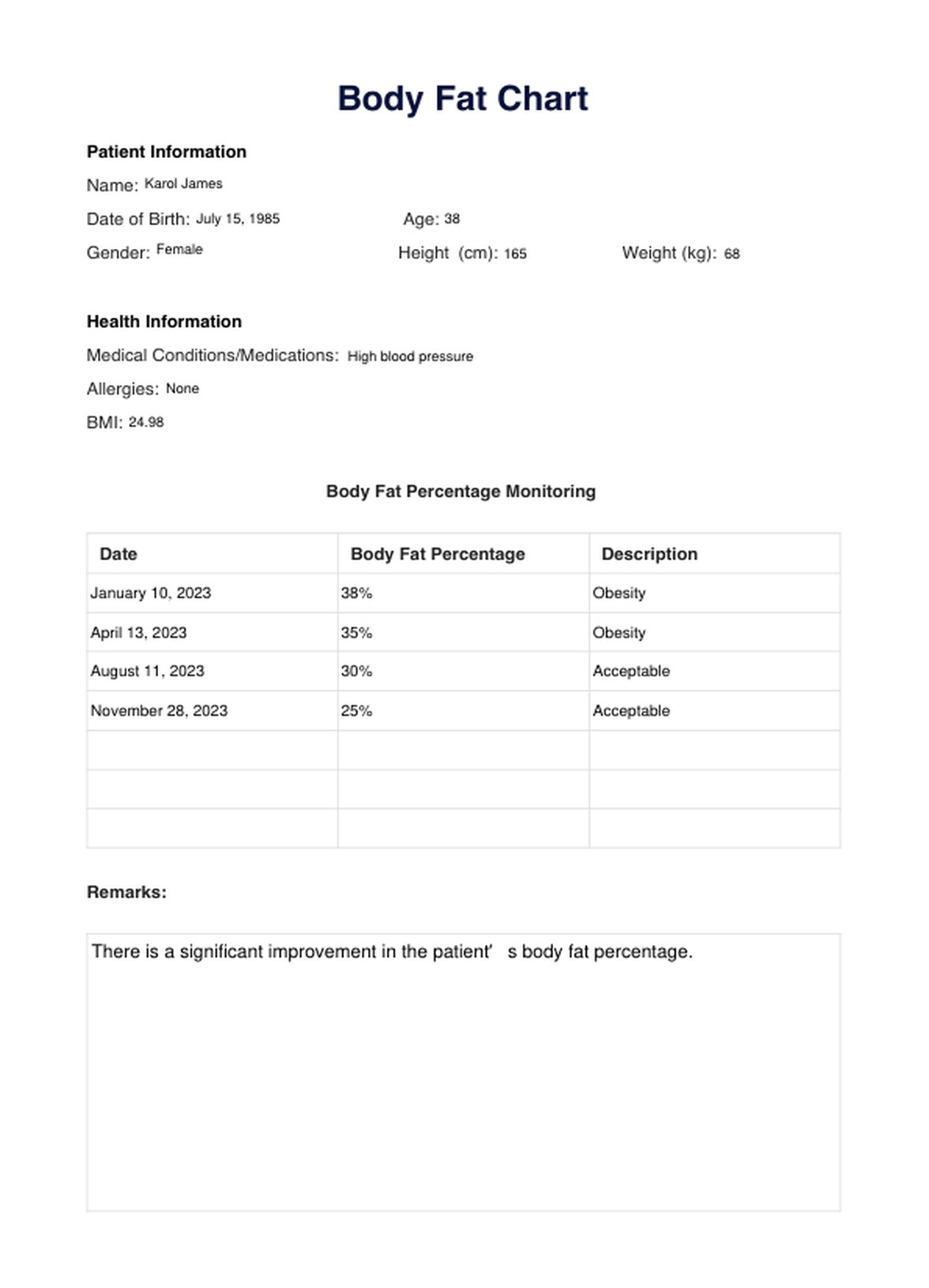 Creating a Body Fat Chart template involves designing a table with corresponding body fat percentage ranges for males and females. Include sections for patient information, such as name, age, gender, height, weight, and BMI.
