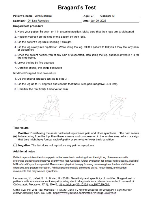 Conduct the Bragard's Test to assess whether lower back pain is caused by nerve root compression. Use our template for quick and consistent testing.