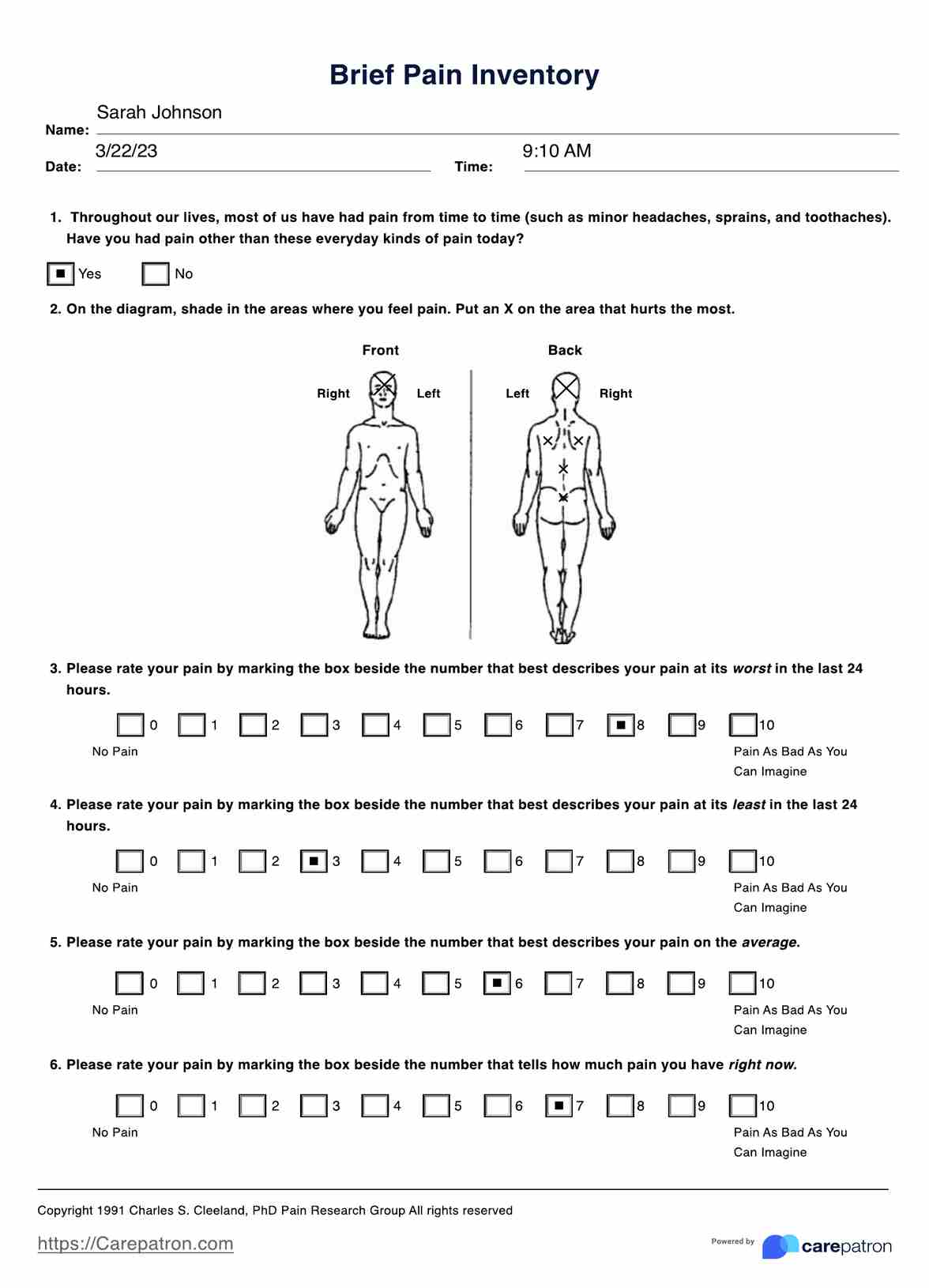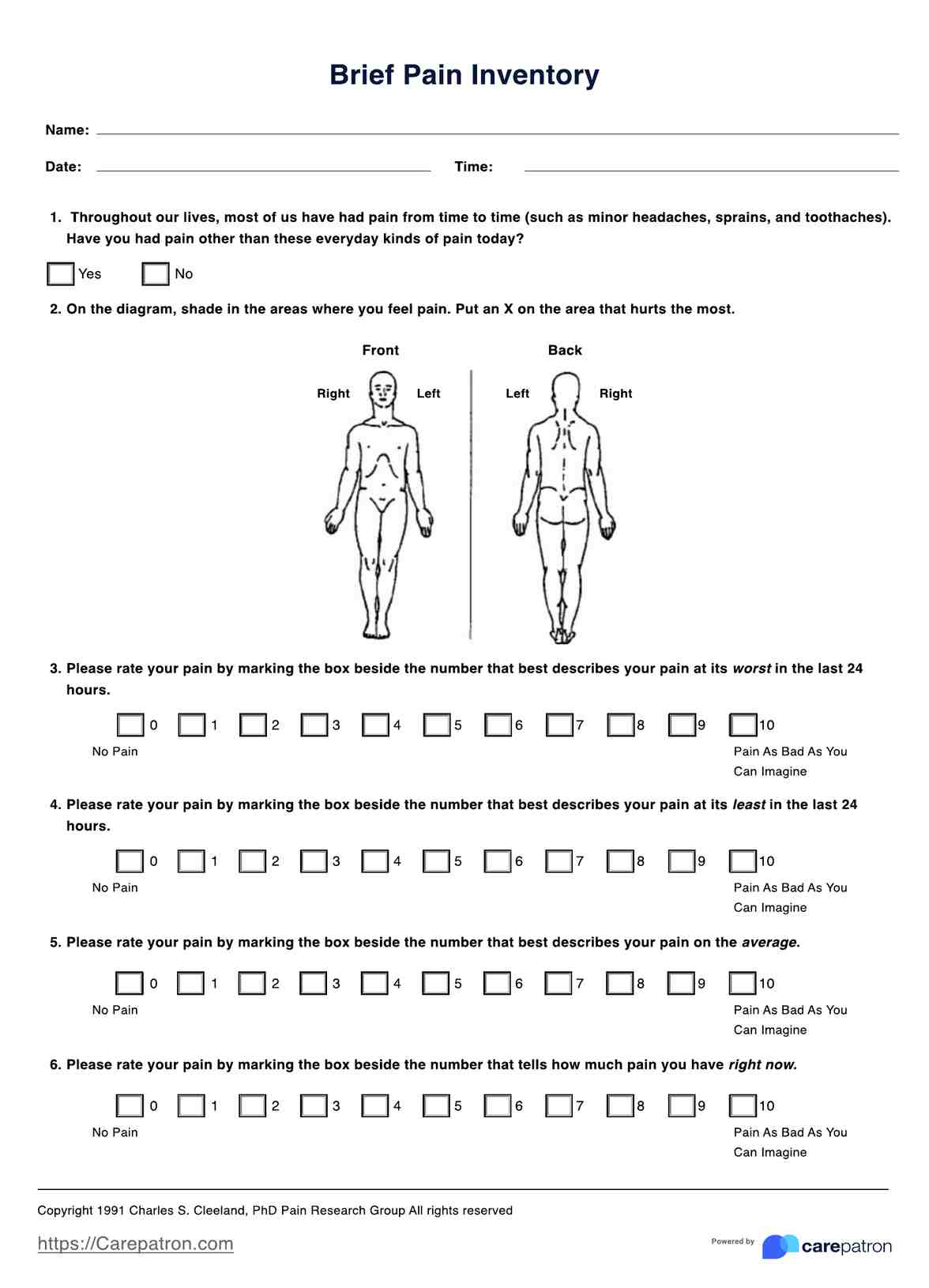 The frequency of administration of the Brief Pain Inventory depends on the patient's needs and circumstances. Depending on the patient's pain management plan, it can be administered as frequently as daily or weekly or as infrequently as every few months.