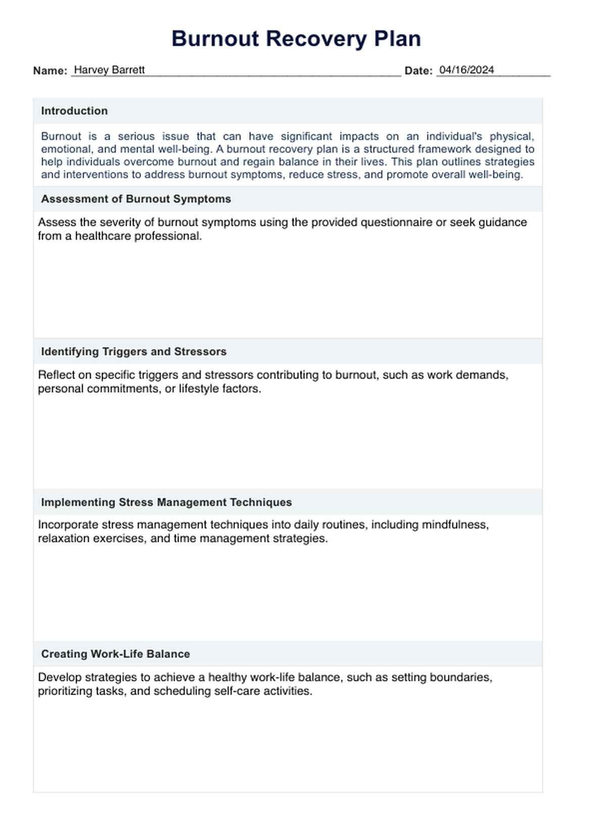 Get your free PDF of a burnout recovery plan from Carepatron to help you overcome burnout and regain work-life balance. Explore practical recovery strategies.