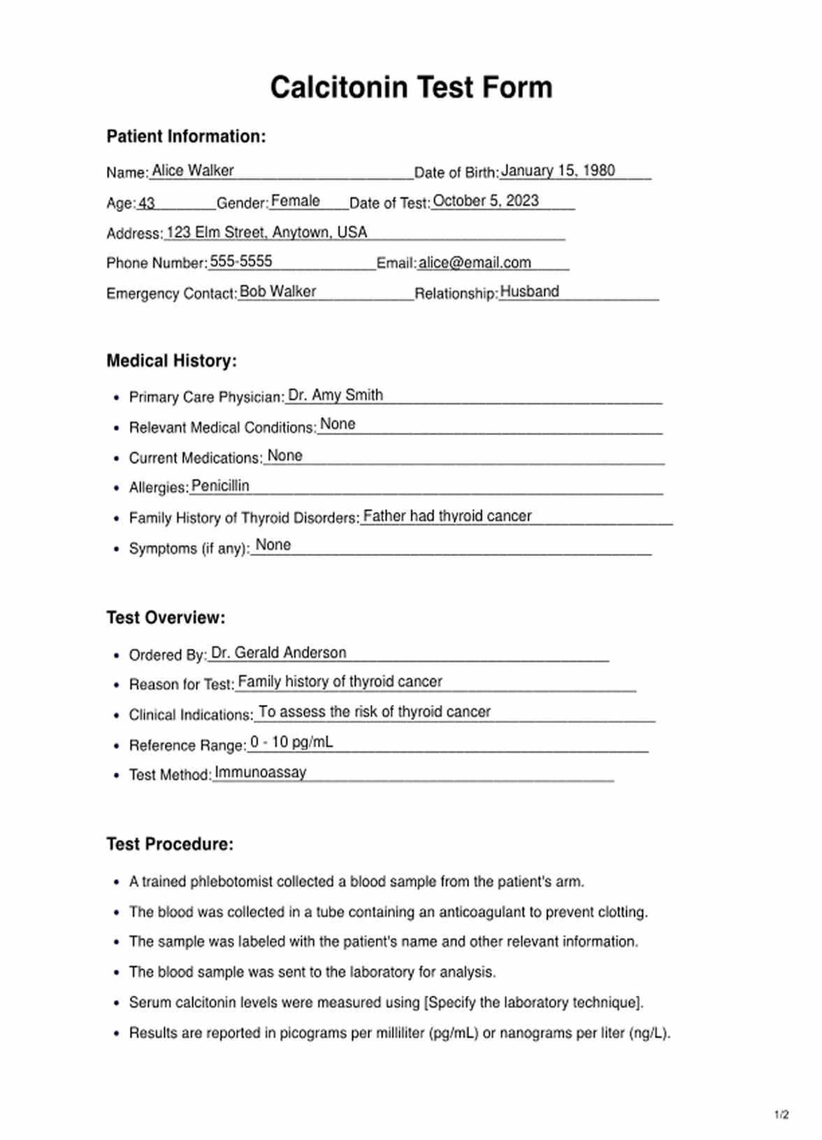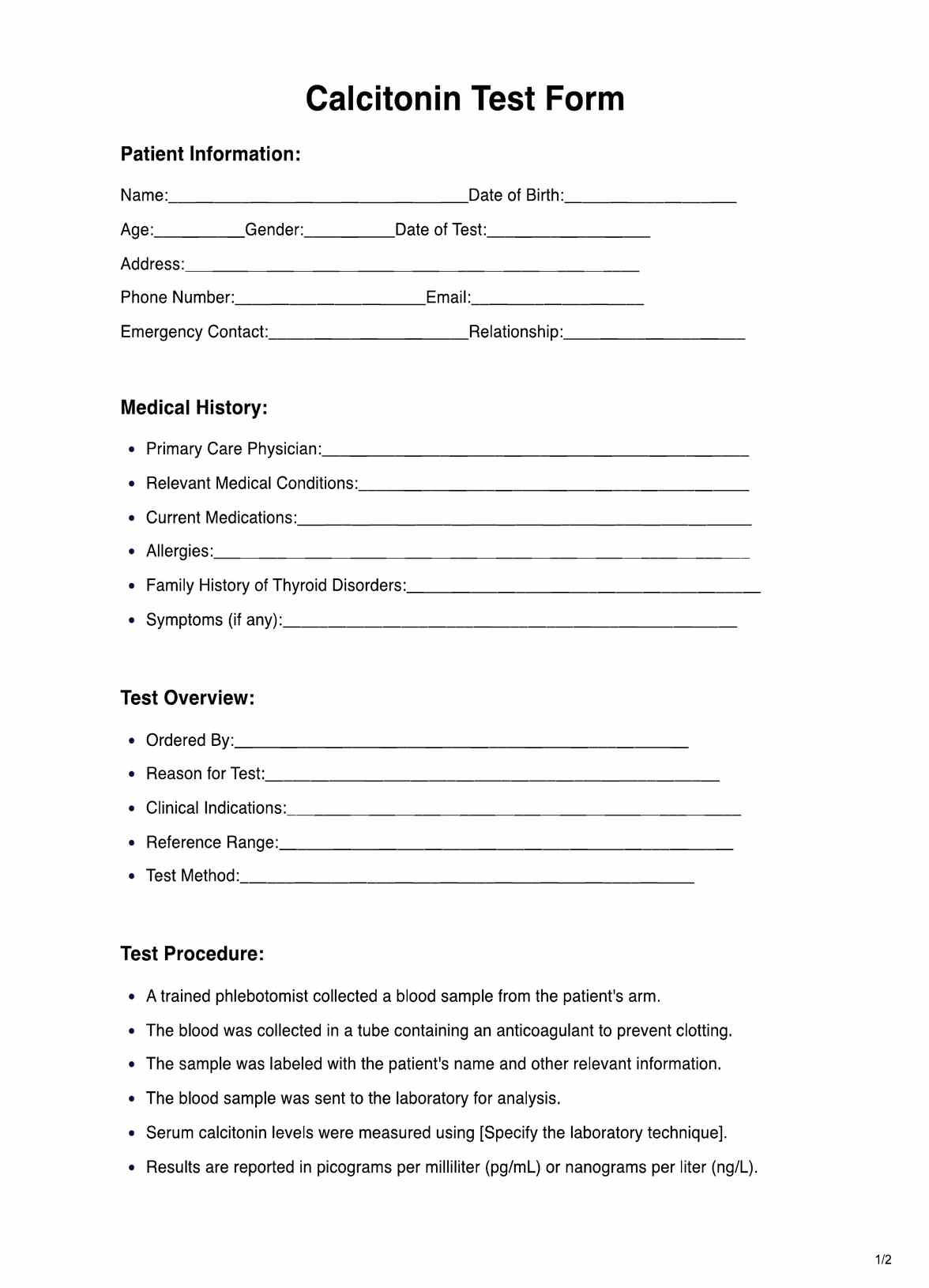 Discover the significance of the Calcitonin Test and how it's conducted. Get a free PDF example of a Calcitonin Test form.