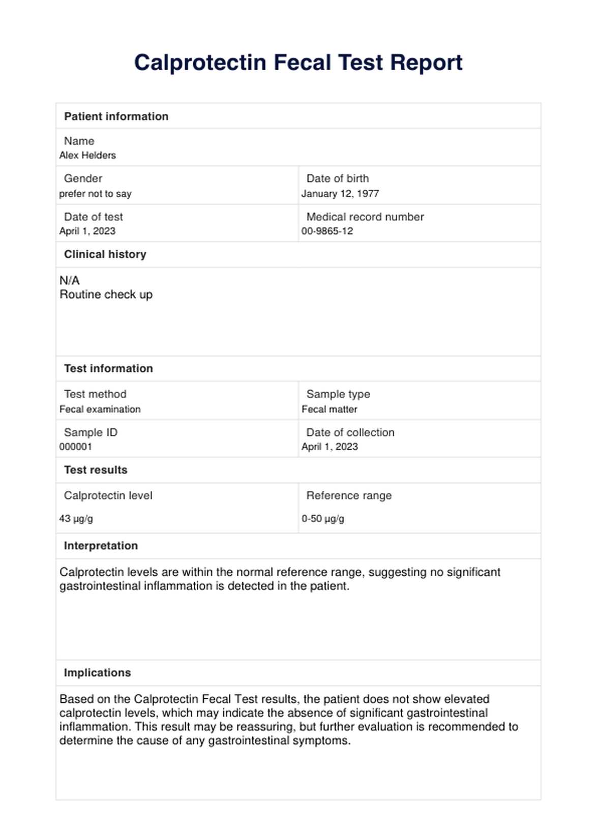 Download a Calprotectin Fecal Test Report template and an example for reference. Learn about the importance of this test and how to interpret results.