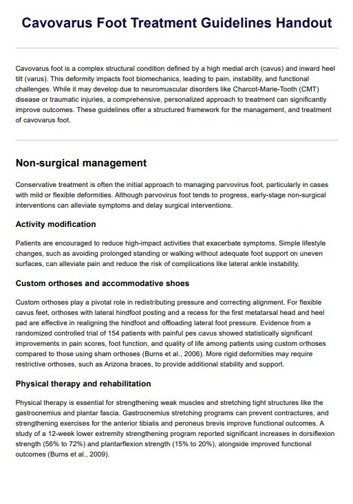 Discover the benefits of our Cavovarus Foot Treatment Guidelines Handout for healthcare professionals. Download now and enhance patient care with this comprehensive PDF.