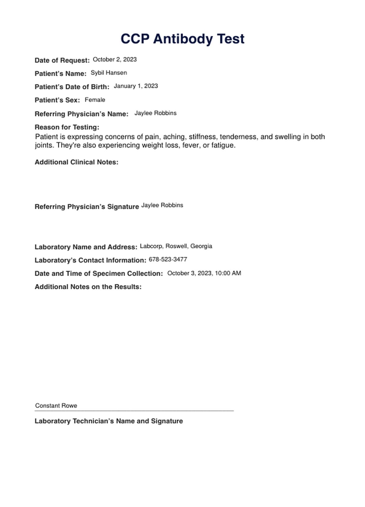 All healthcare practitioners who assess their patients for symptoms and those who treat rheumatoid arthritis, like general physicians, rheumatologists, orthopedic surgeons, and internists, can request a CCP antibody test using our template.