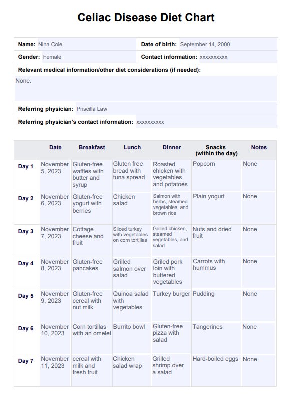 Use our free Celiac Disease Diet Chart to plan your patient's gluten-free meals. Download the PDF template now.