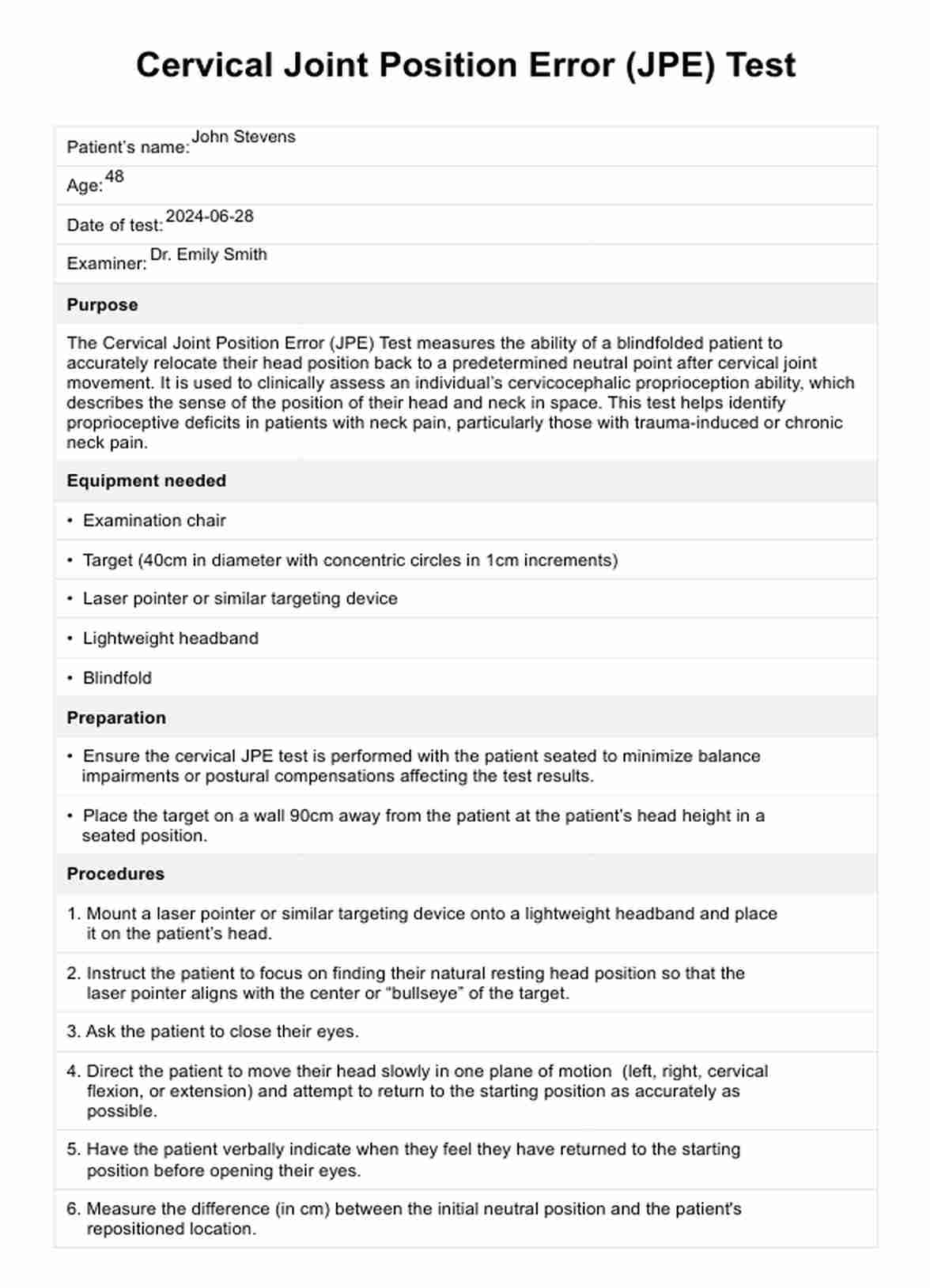 Optimize patient care with our Cervical Joint Position Error Test template. Accurate, efficient, and standardized documentation for better outcomes. Download now!