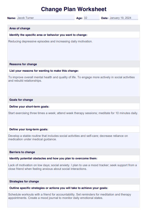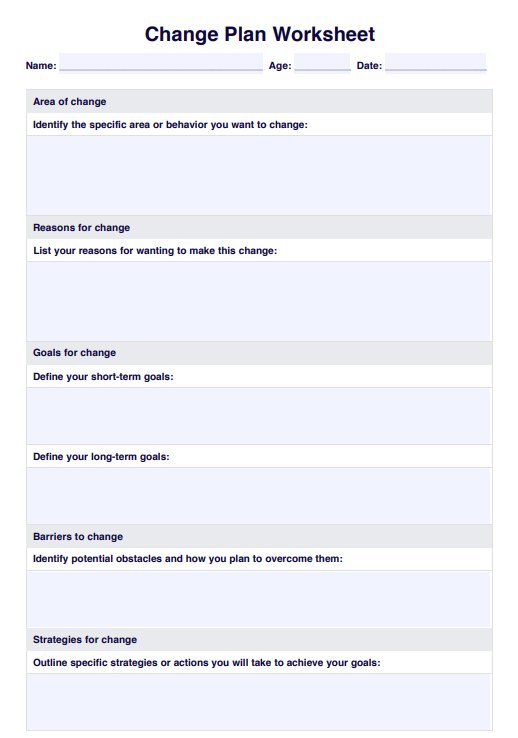 A change plan worksheet is a tool used in therapy, especially addiction counseling, to help clients identify their goals, motivations, barriers, and strategies for change. It outlines a personal plan for making meaningful life changes.