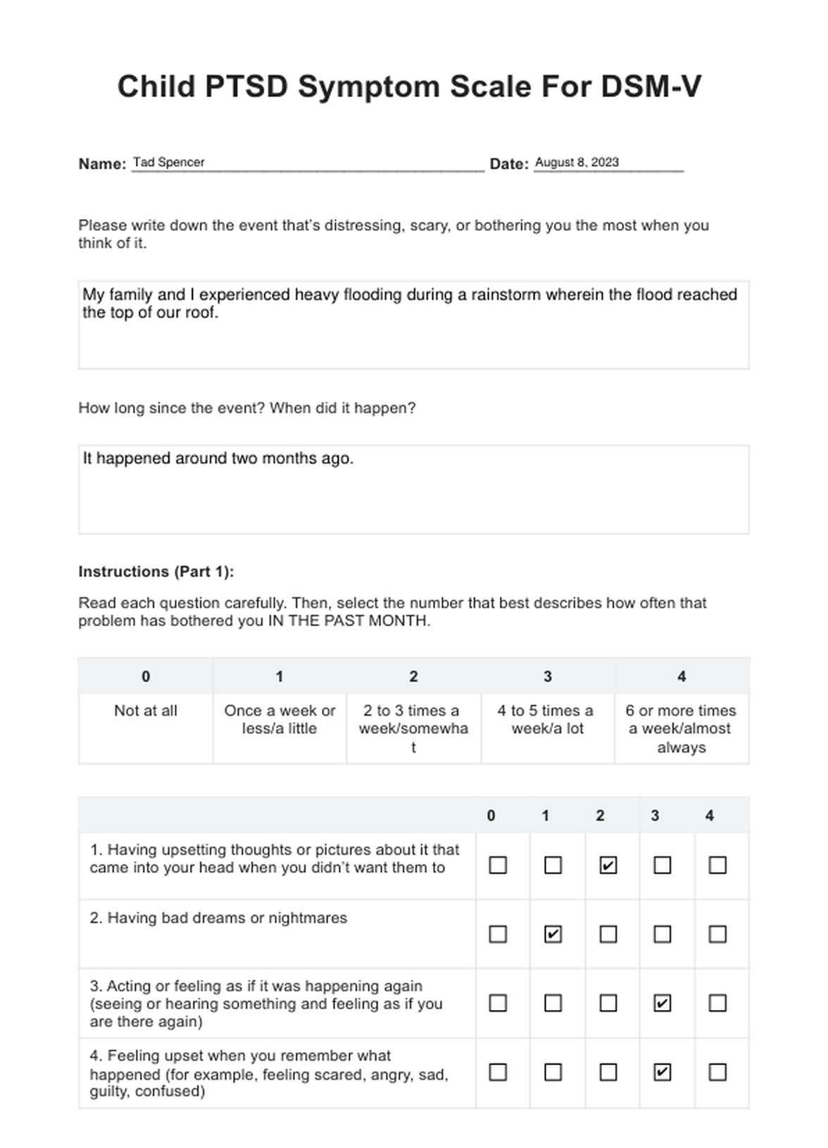 Evaluate the severity of post-traumatic stress disorder using the Child PTSD Symptom Scale based on DSM-5 diagnostic criteria of PTSD.