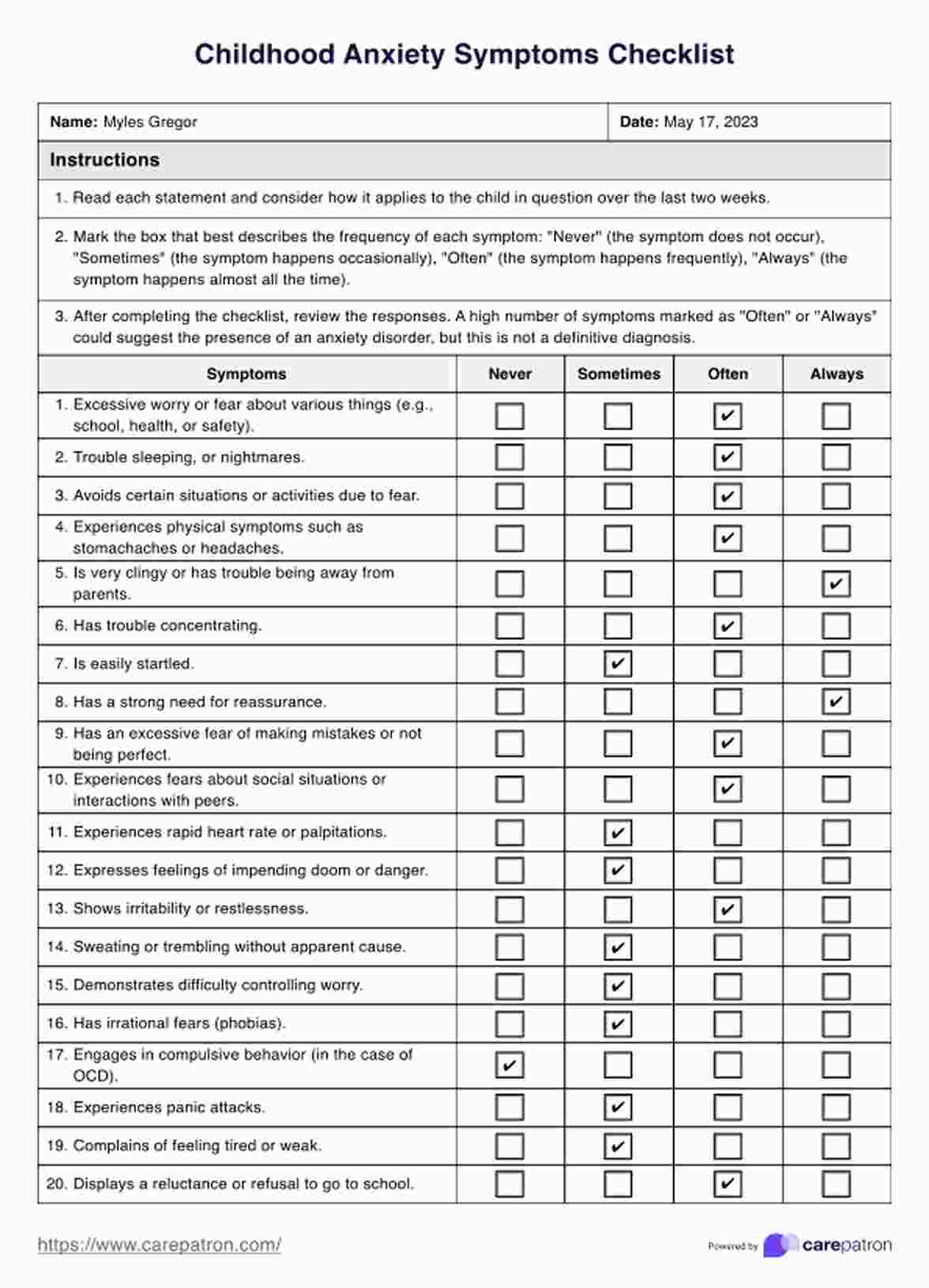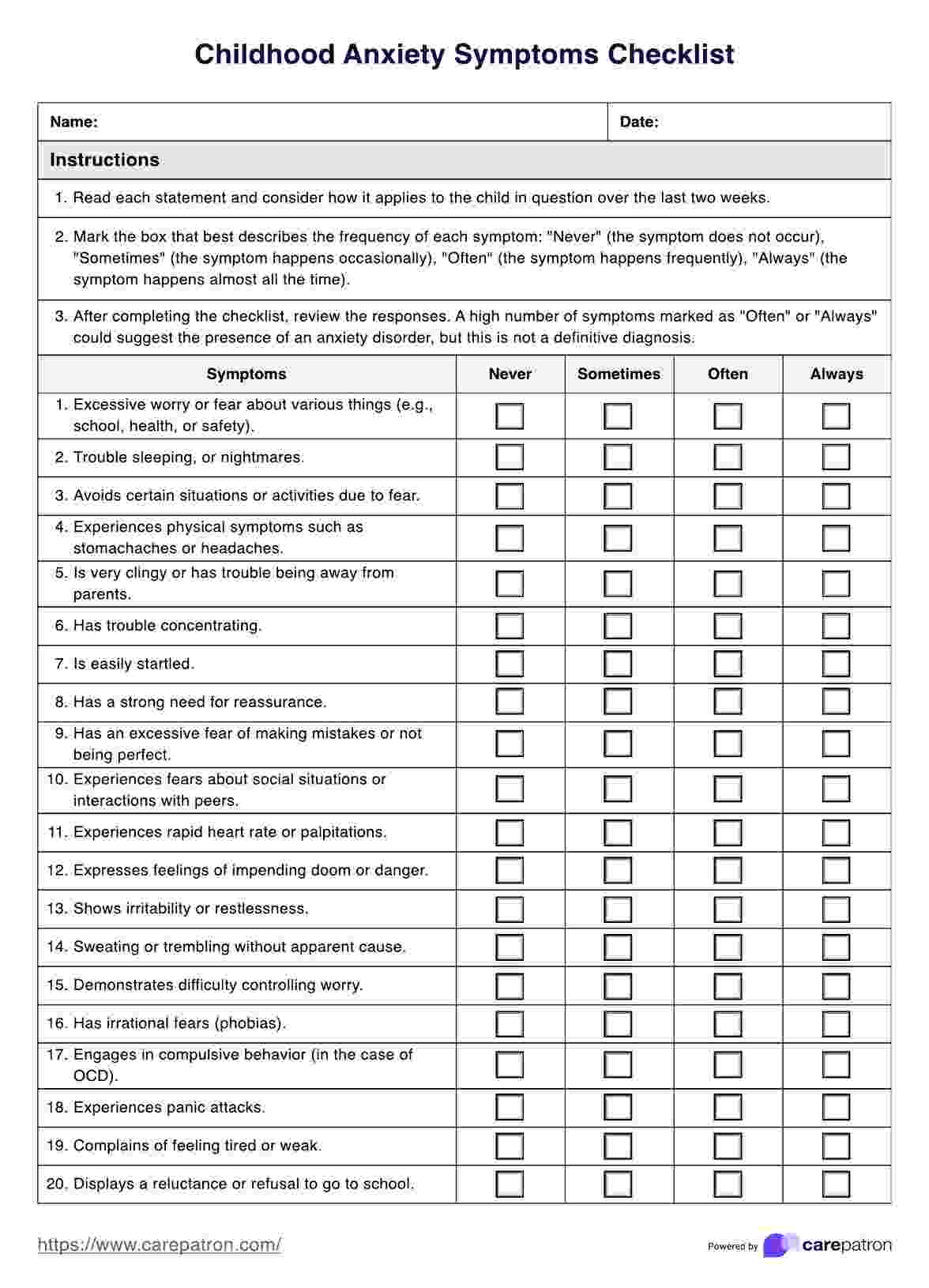 Childhood Anxiety Symptoms Checklists should be stored securely due to their sensitive information. Digital platforms like the Carepatron app offer secure, HIPAA-compliant storage solutions for these checklists.