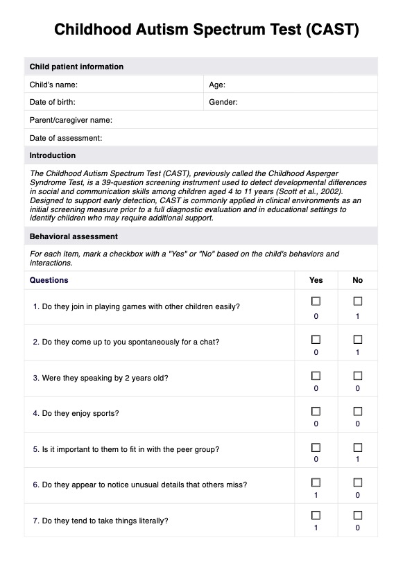 The CAST entails a questionnaire of 39 items, commonly filled out by a parent or caregiver of a child aged 4 to 18 years. Typically, it takes around 20 to 30 minutes to finish, assuming they know what to tick for all items.