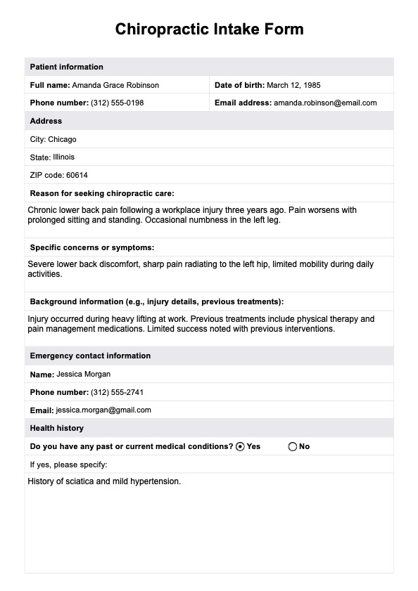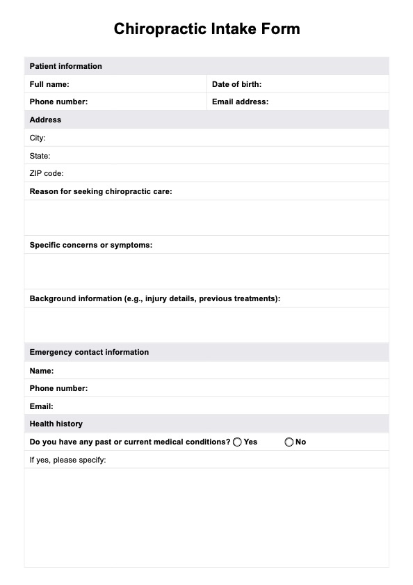 Get access to a free Chiropractic Intake Form from Carepatron. Streamline your clinical documentation with this PDF template.