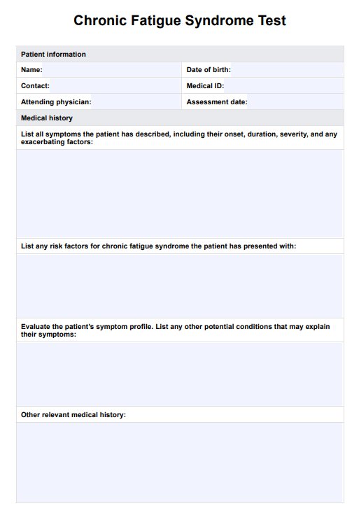 Download a free Chronic Fatigue Syndrome Test template, a tool specifically designed to facilitate the process of diagnosing clients with chronic fatigue syndrome (ME/CFS)