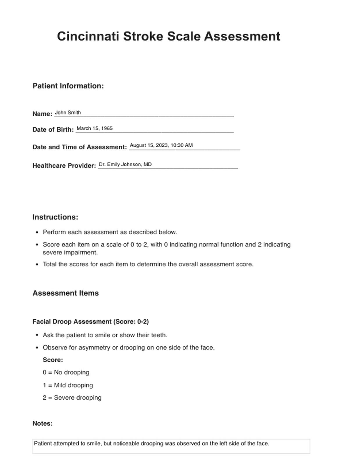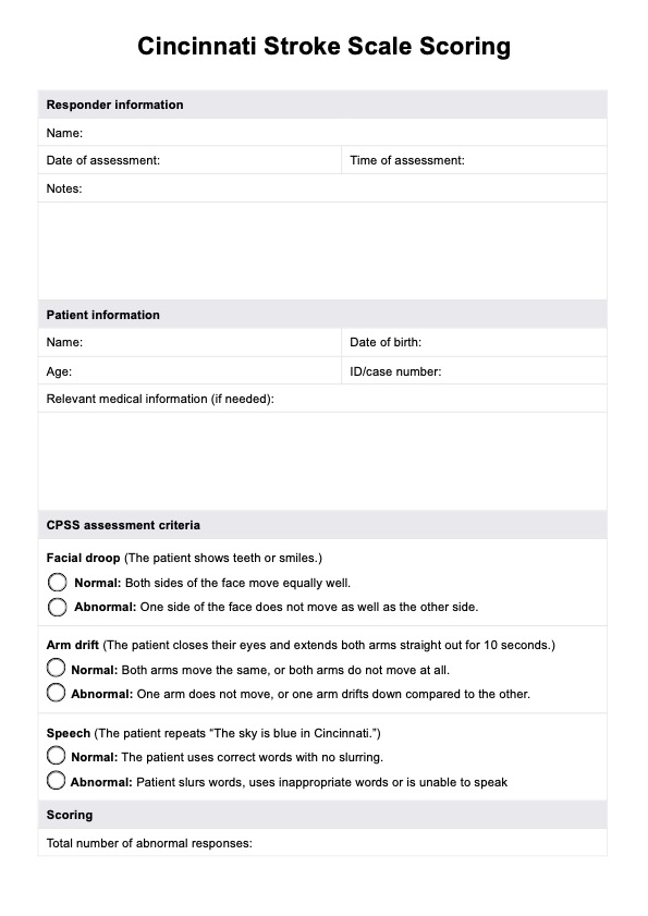 Download Carepatron's free Cincinnati Stroke Scale PDF template and aid rapid stroke assessment with detailed guidelines.