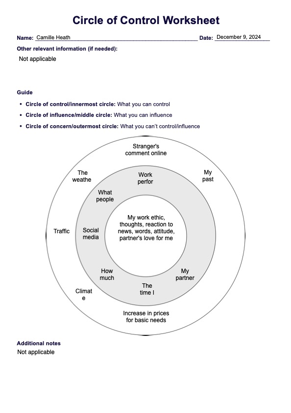 It’s as simple as either filling it out alongside the patient or giving them a copy to answer independently. For a more comprehensive step-by-step, please refer to the “How does this Circle of Control Worksheet Work” section.