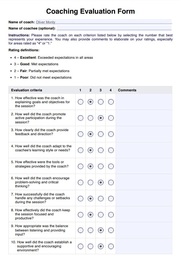 Coaching Evaluation Forms can be used after individual sessions, periodically during performance reviews, or at key transition points, such as employee onboarding or role changes. The frequency depends on the evaluation process's goals and the need for consistent feedback.