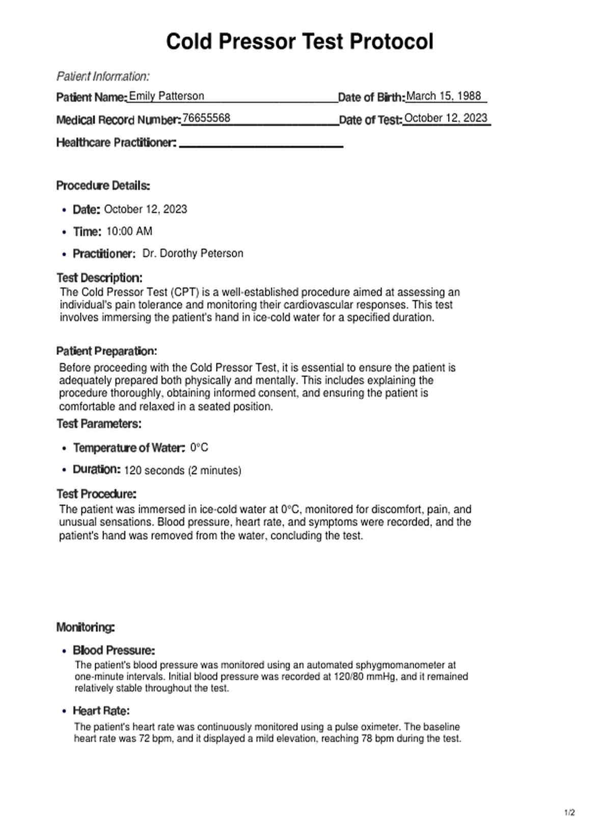 Common parameters include water temperature (usually 0°C), test duration (typically 1-5 minutes), and monitoring of blood pressure, heart rate, and symptoms.