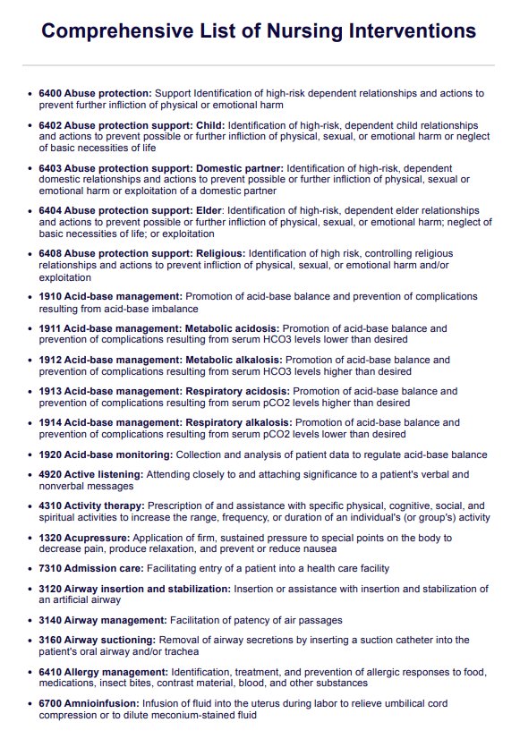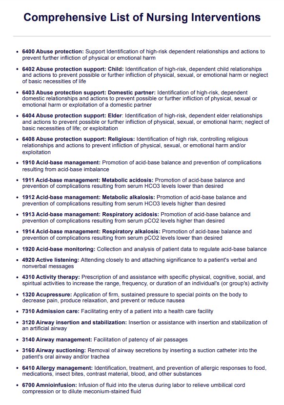 Access our free List of Nursing Interventions PDF. Streamline patient care with this comprehensive, editable resource based on the NIC's l5th edition.