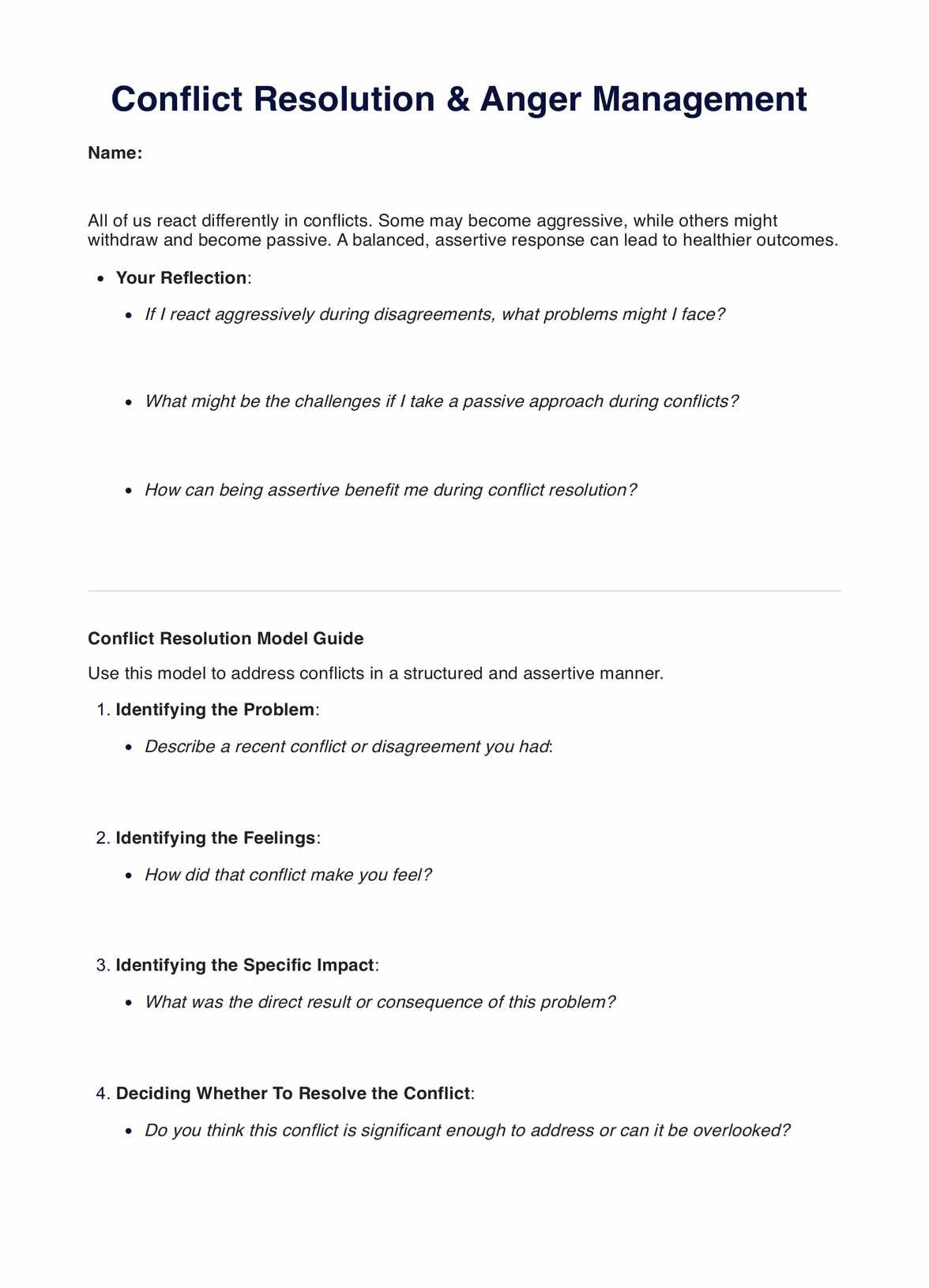 A Conflict Resolution Worksheet is a template that helps individuals and groups navigate and resolve conflicts in an organized and structured manner. It provides a structured framework for determining the root cause of the conflict, outlining specific concerns and issues, and brainstorming potential solutions.