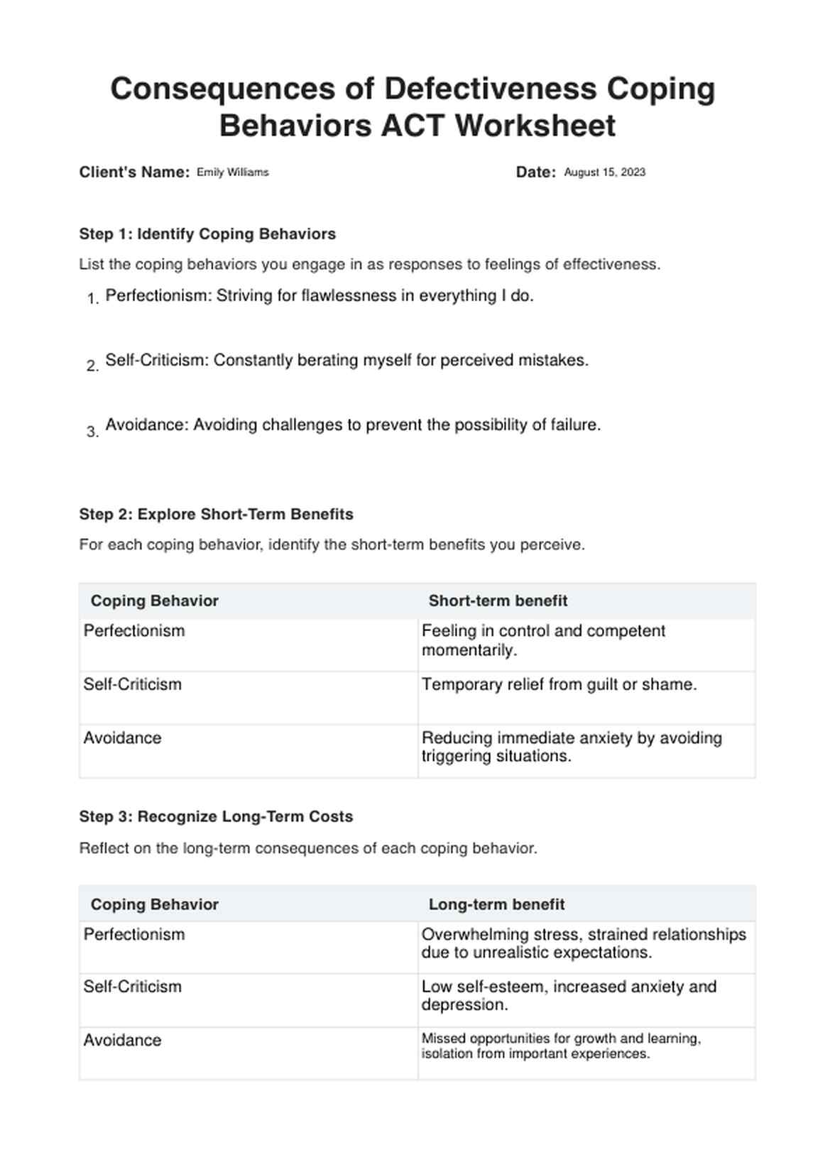 Consequences of Defectiveness Coping Behaviors ACT Worksheet Template