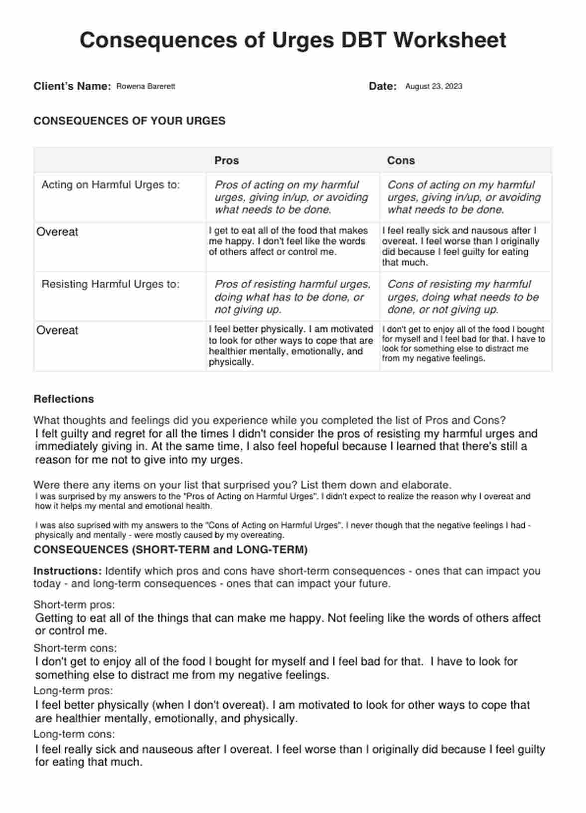 Clients who have urges or act upon urges of harmful behavior and are still capable of reflecting and resisting may use the Consequences of Urges DBT Worksheet upon the recommendation of their referring physician.