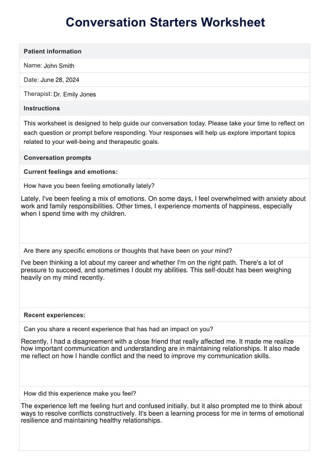 Explore this effective Conversation Starters Worksheet for healthcare professionals. Enhance therapy sessions with structured prompts for meaningful client engagement.