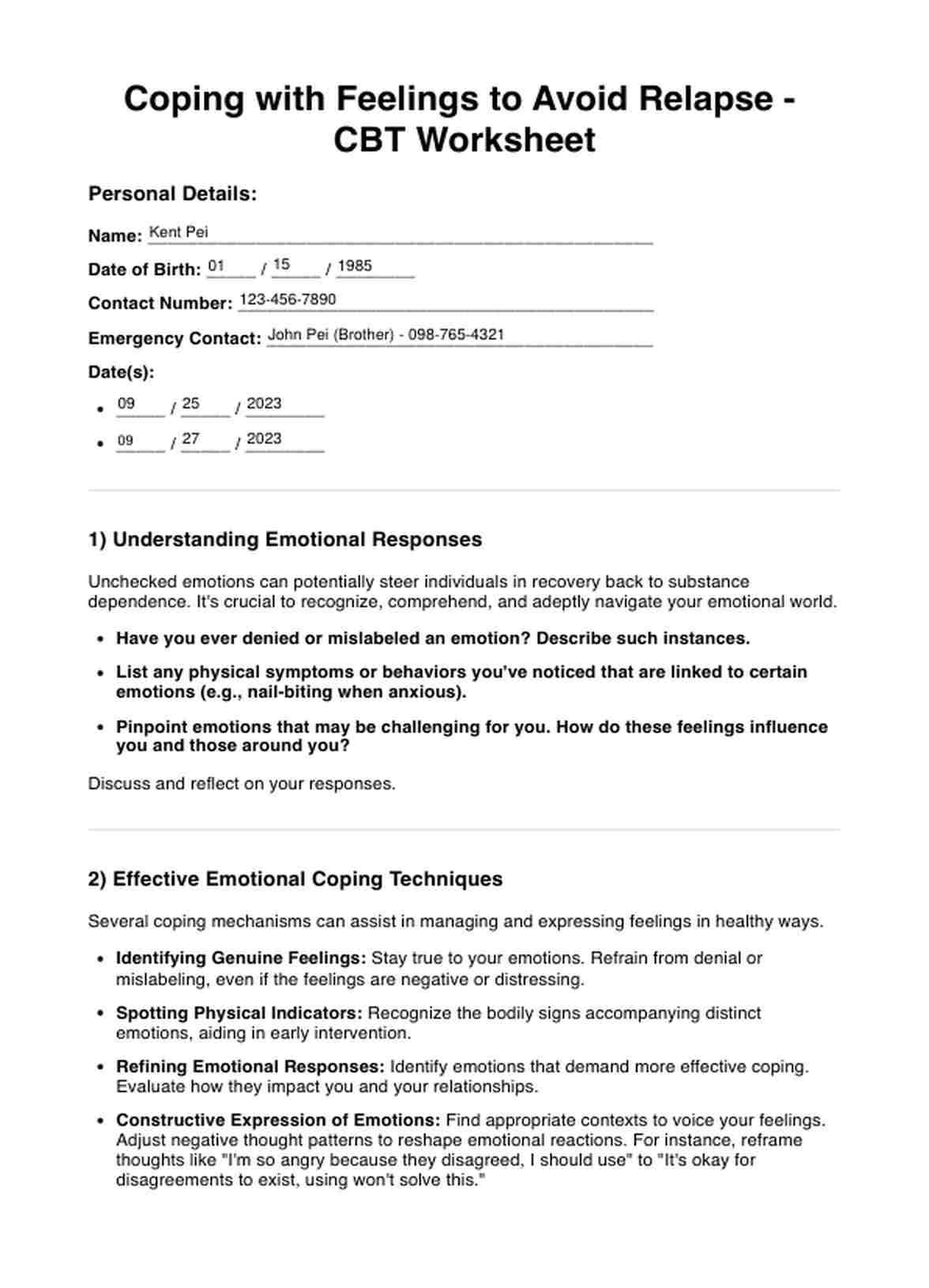 Coping with Feelings to Avoid Relapse CBT Worksheet Template