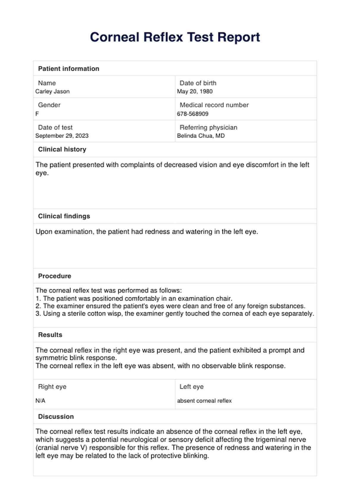 Access a free Corneal Test Report template and accurately document the results of a corneal reflex test. Download the free PDF and example here.