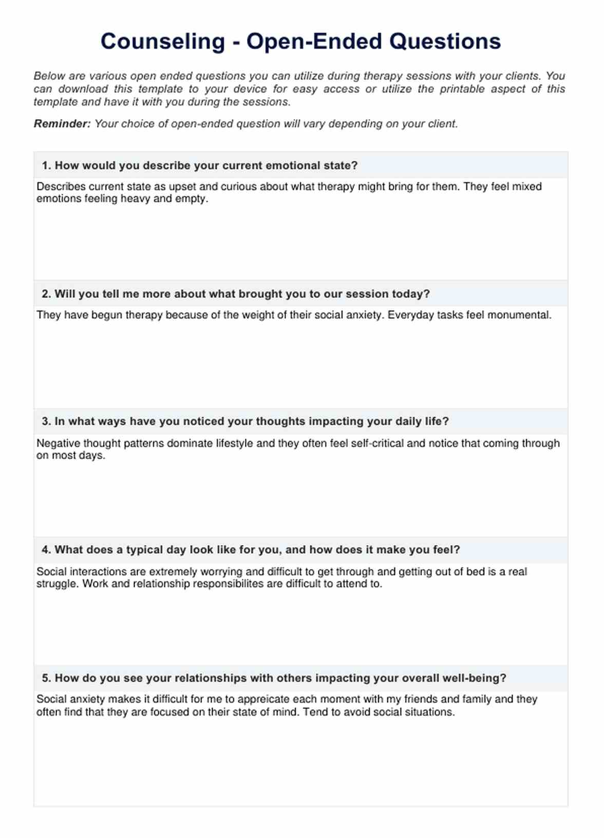 Close-ended questions don't allow clients to explain their situation or point of view entirely. These questions often elicit a "yes" or "no" answer. Open-ended questions will enable the individual to explain further and allow for reflection.