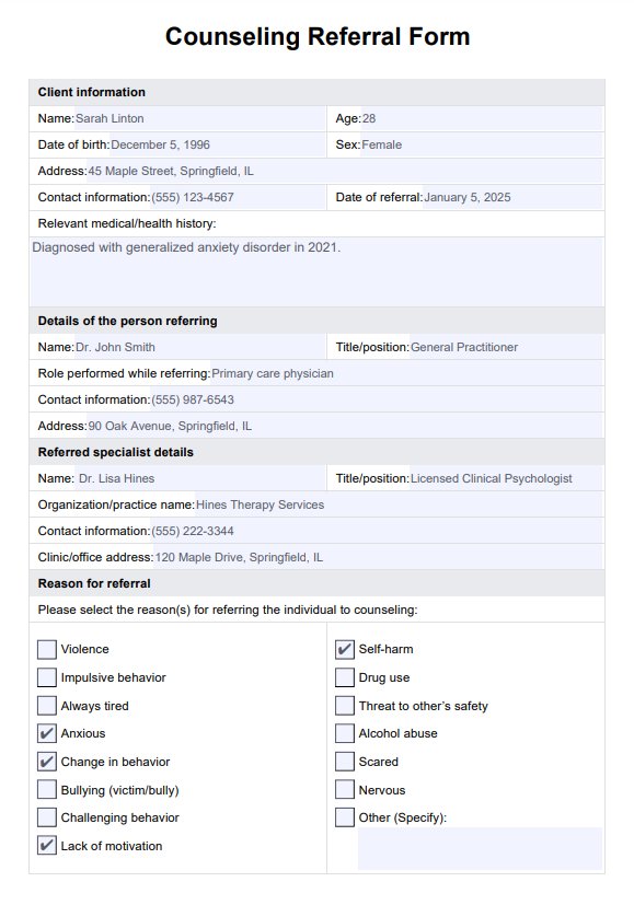 A referral form is completed when there is a need to refer a student or patient for counseling due to concerns about their emotional or behavioral well-being, ensuring they receive appropriate support from a school counselor or other mental health professionals.