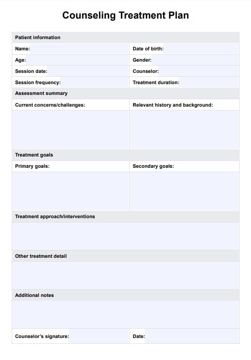 Access our Counseling Treatment Plan template to streamline how you document goals, strategies, and interventions for counseling.