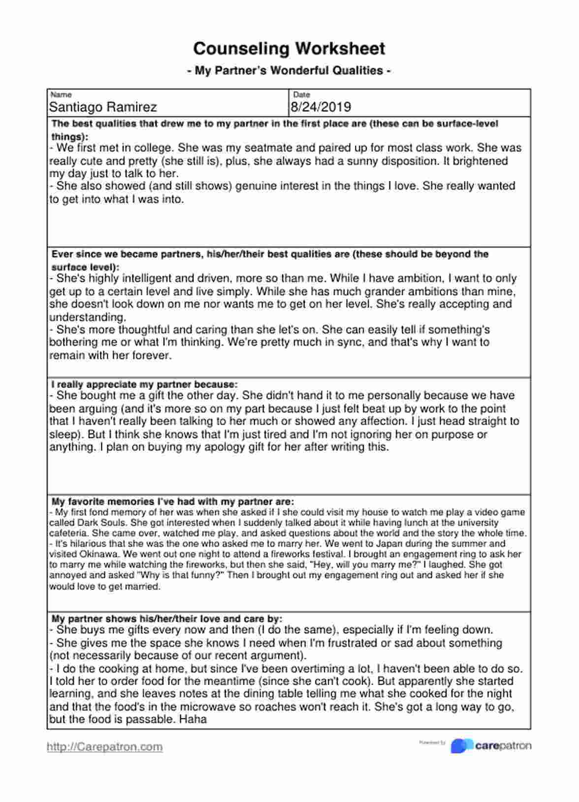 That depends on what kind of counseling you’re giving. Some should be on the client’s own time if it’s related to their mental health. As for this counseling worksheet example, it’s best to issue it after the first or second appointment, especially if the rift between couples isn’t huge yet. The earlier, the better.