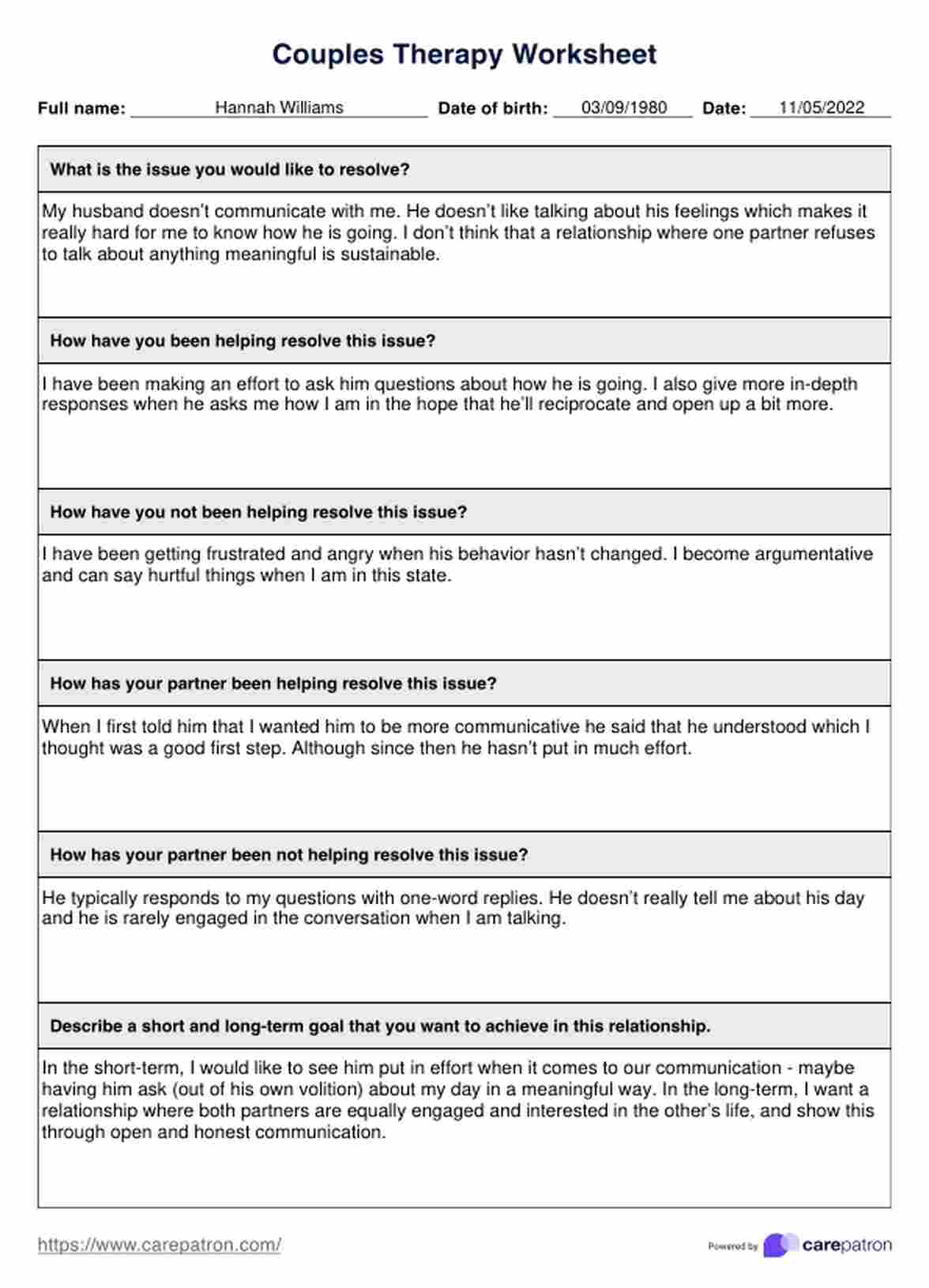 Incorporate our couples therapy worksheet template into your practice. Intuitive and well-designed, you can help couples strengthen communication and trust.
