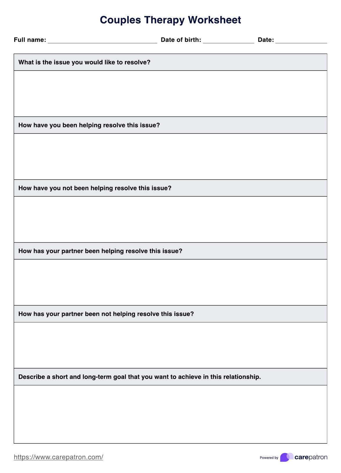 Common topics covered in Couples Therapy Worksheets include communication, conflict resolution, intimacy, trust, and emotional support. They may also cover specific issues such as financial management, parenting, and in-laws.