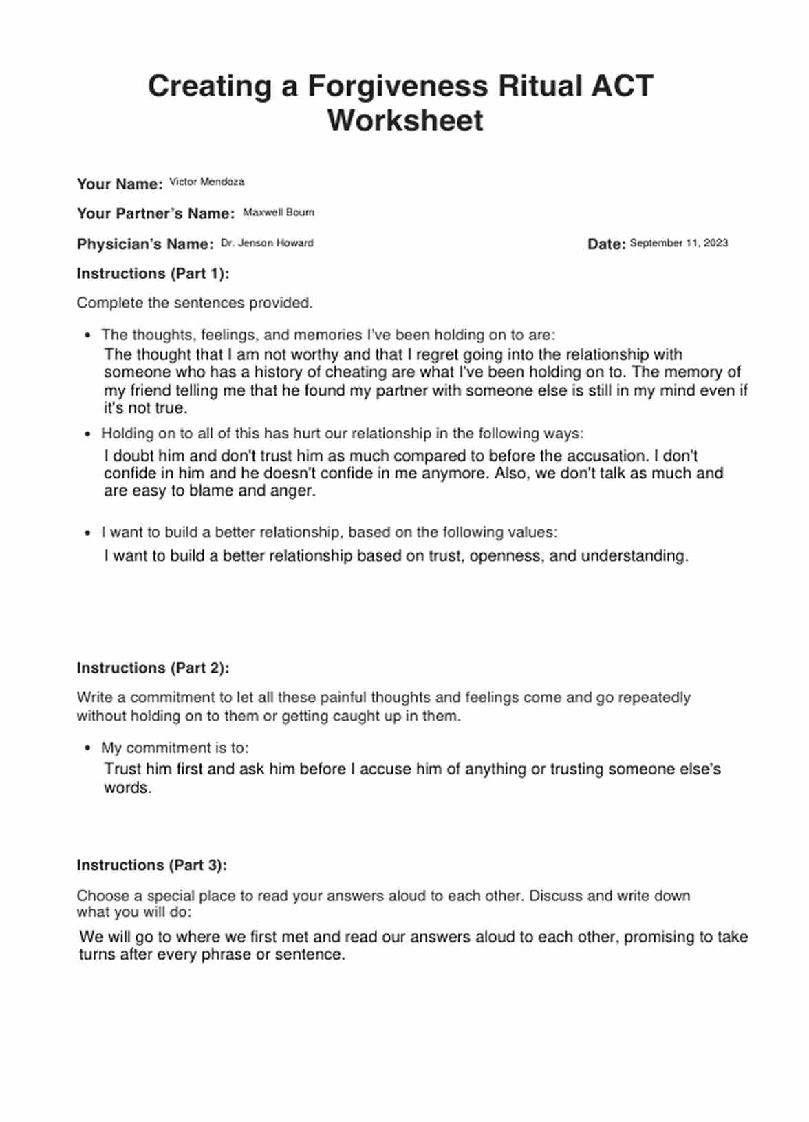 Clients and practitioners can use the Creating a Forgiveness Ritual ACT Worksheet during couples therapy sessions or at home after the said couple has a fight/disagreement.