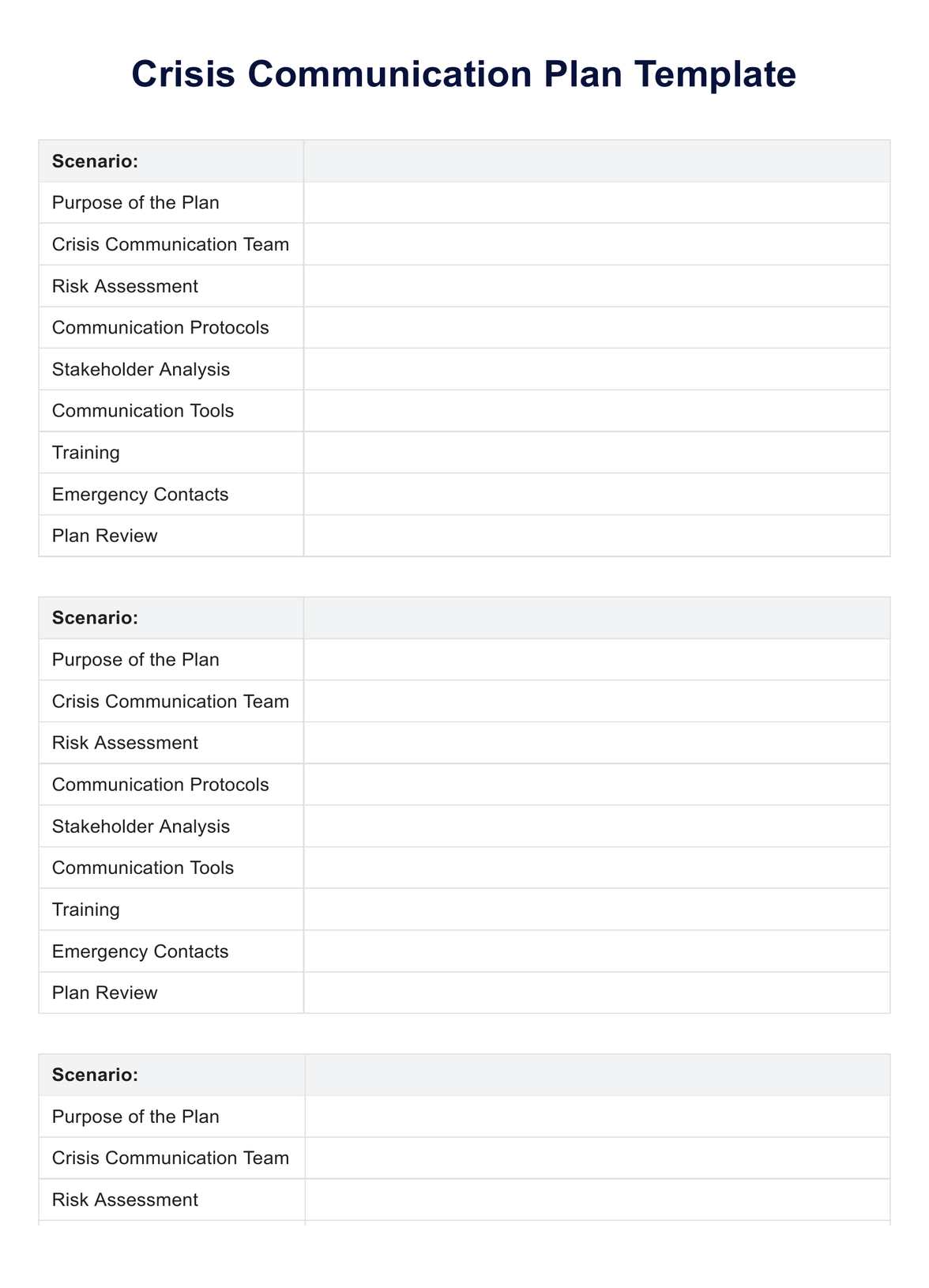 The template provides a breakdown of manageable steps to mitigate or prevent a crisis. It includes risk identification, crisis management, safety steps, and contacts.