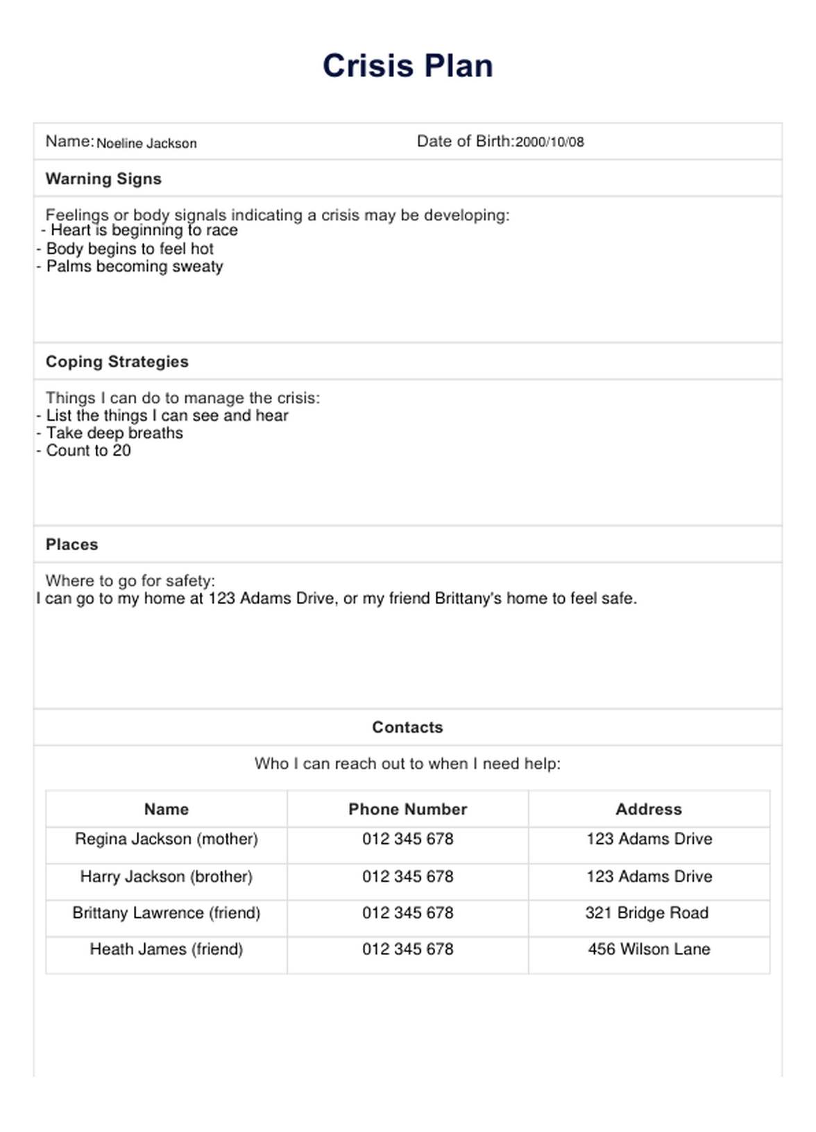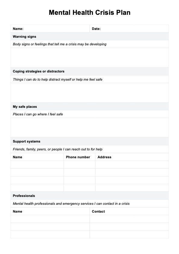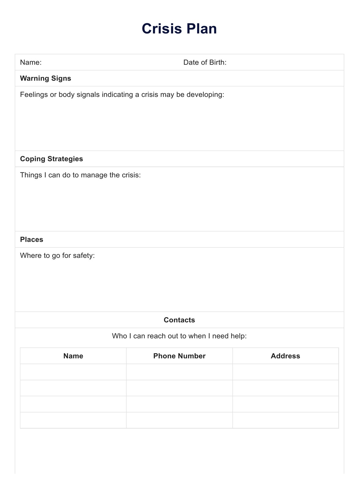 Crisis Plan Templates are used in various scenarios requiring a way to manage and prevent crises. A client typically creates the plan alongside a healthcare professional, but copies of the plan may be given to trusted support networks if the client wishes.
