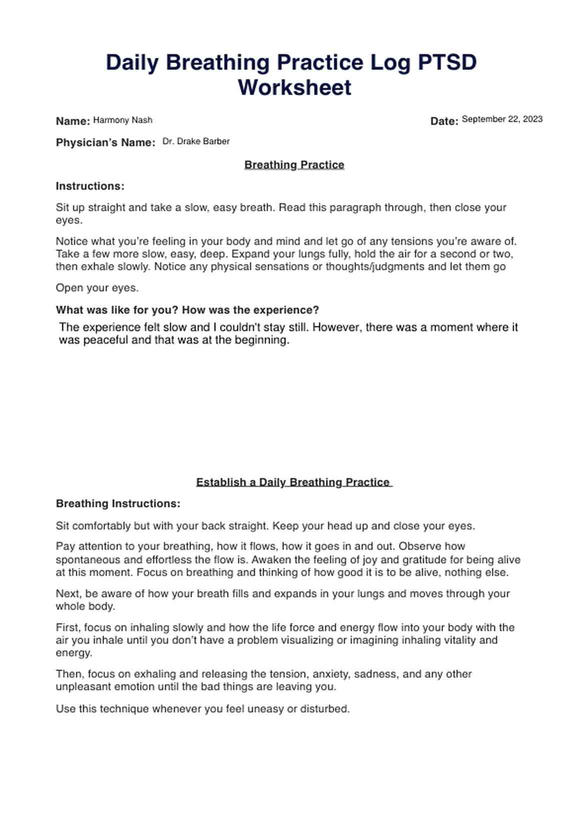The reflection and logging of the Daily Breathing Practice Log PTSD Worksheet can take as short as 20 minutes. However, doing the breathing practice may take a while, mainly if the client isnt used to it.