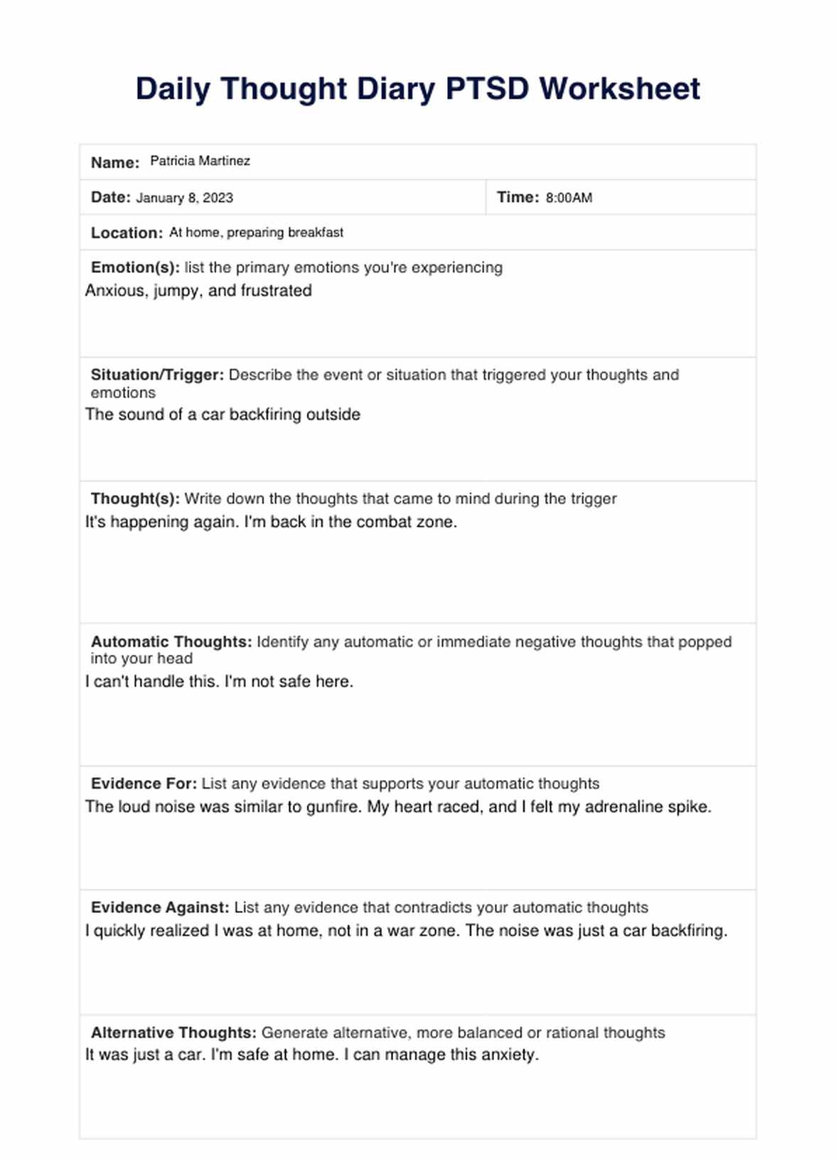 You can use the Daily Thought Diary PTSD Worksheet to track your client's thoughts, feelings, and triggers. It can help identify patterns that may play a role in their PTSD.