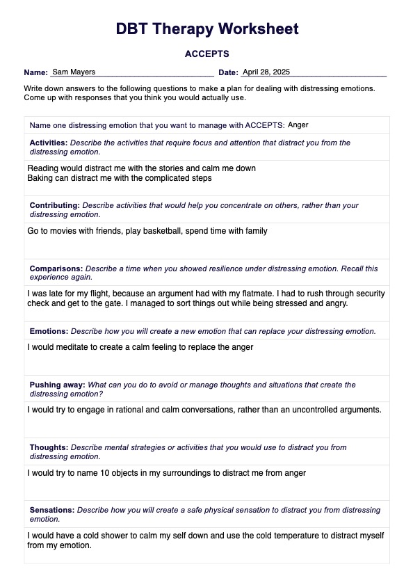 DBT therapy worksheets are most successful when used in conjunction with a structured treatment plan. They can be used to help individuals become more mindful of their feelings and behavior, identify triggers and develop coping strategies, help manage difficult emotions, practice healthy communication skills, and work through complex issues that may arise in therapy.
