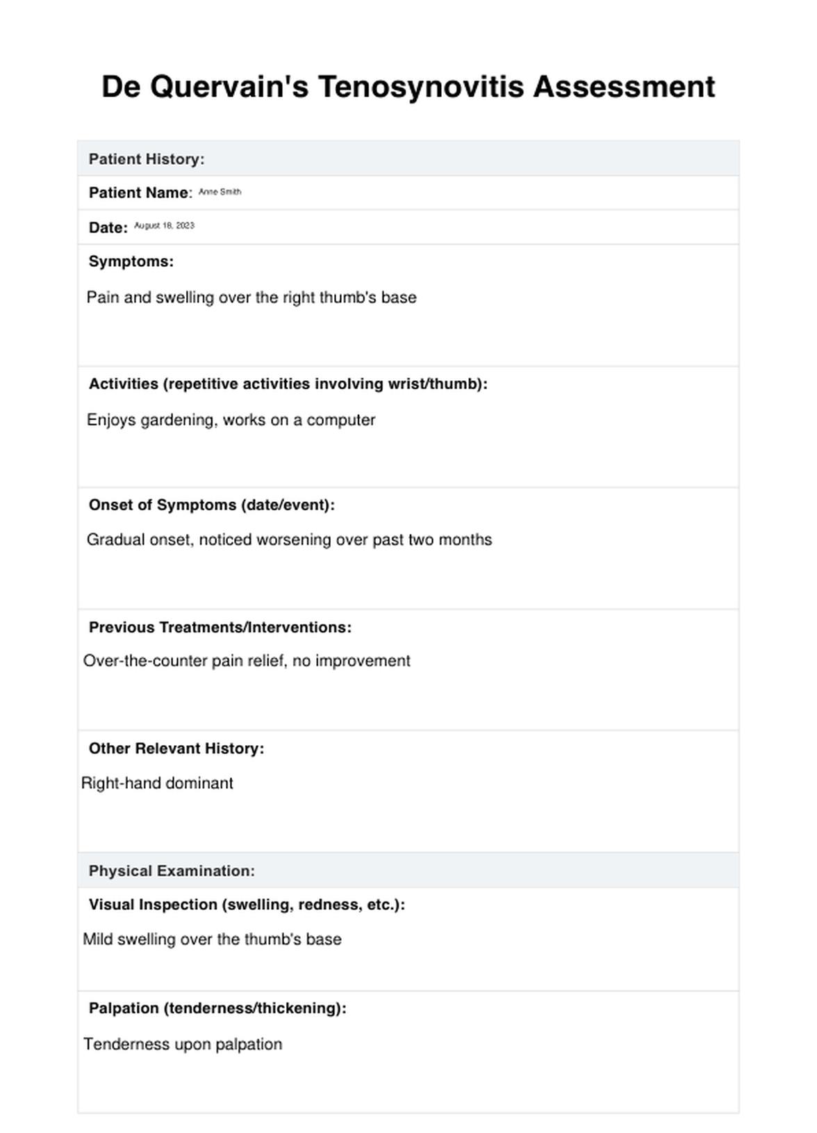 Discover all you need about De Quervain's Tenosynovitis Test. Learn when to use it, benefits, and more. Download our free PDF example.