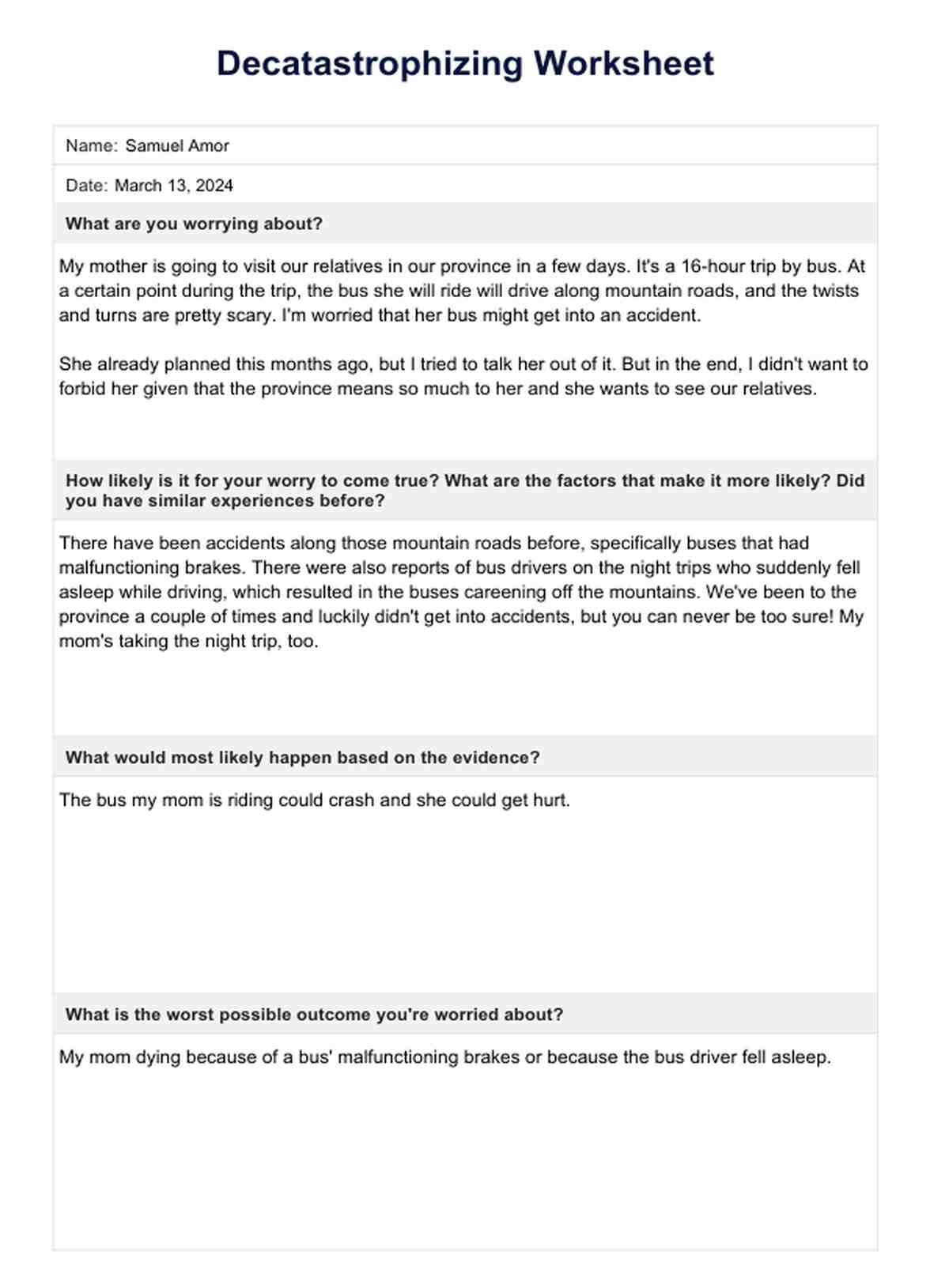Decatastrophizing worksheets were created to help identify and properly understand what a person is worrying about, what they are fearing, and the factors that contribute to them thinking that certain outcomes will happen.