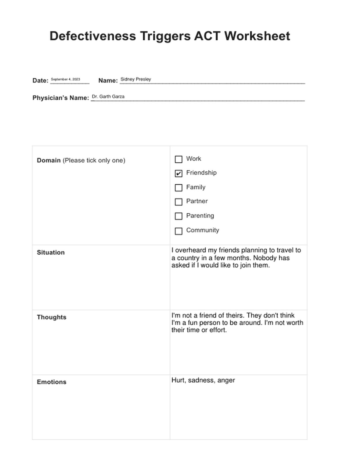 It usually takes a client at most an hour to accomplish one copy of the Defectiveness Triggers ACT Worksheet.