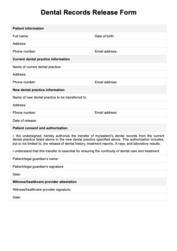 A dental release form is a document that allows a patient to authorize the transfer of their dental records from one dental practice to another.