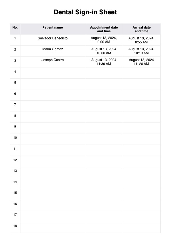 A patient sign-in sheet is a form where patients write their name, appointment time, and arrival time when they arrive at a clinic or dental office.