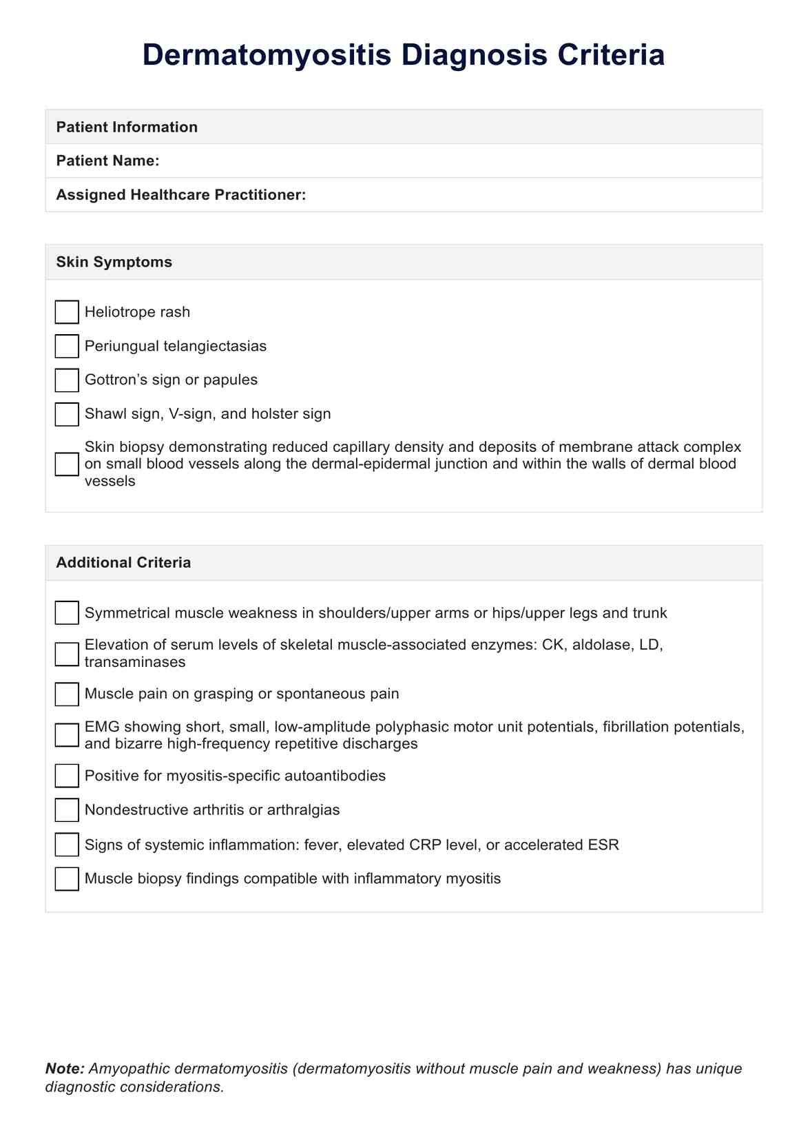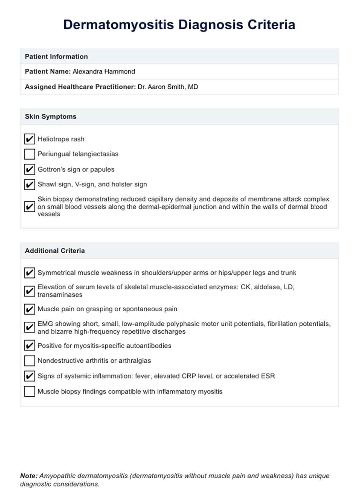 Learn about the diagnostic criteria for dermatomyositis and see an example with Carepatron's free PDF download. Get the information you need to understand this condition.