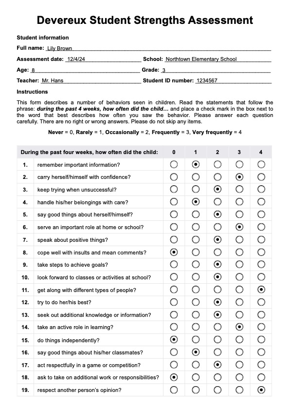 Access our helpful Devereux Student Strengths Assessment template for comprehensively evaluating a child's social-emotional competencies.