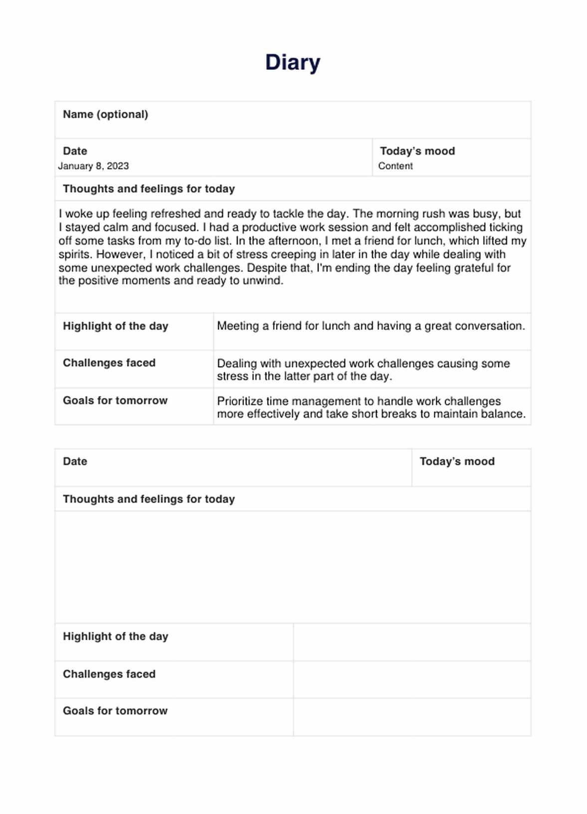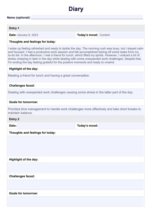 A Diary Template can help your clients begin keeping a journal, which has numerous benefits for their mental health and well-being. It provides a structured way to write about their thoughts, feelings, and experiences, allowing them to reflect on their life and track patterns or progress.