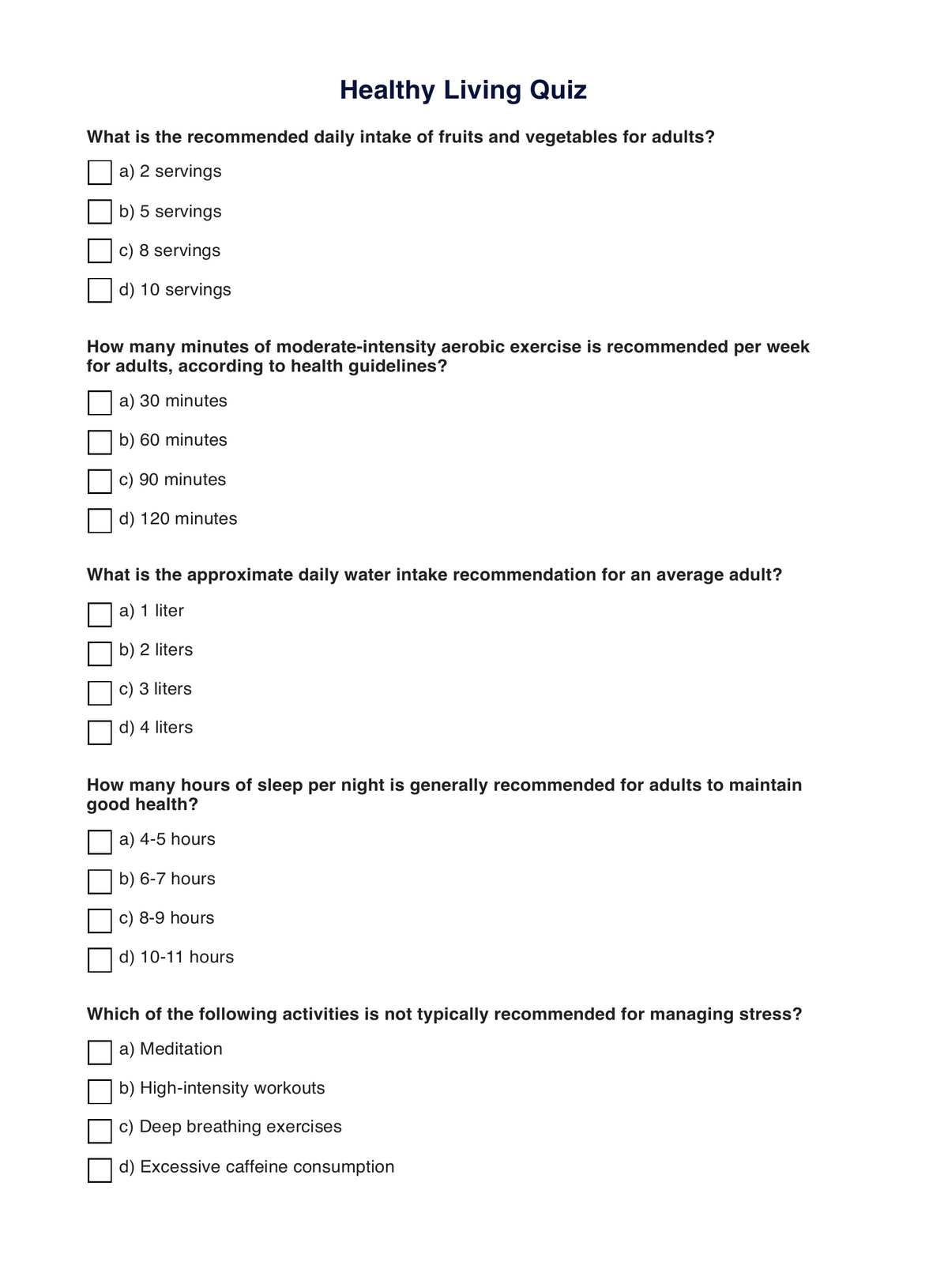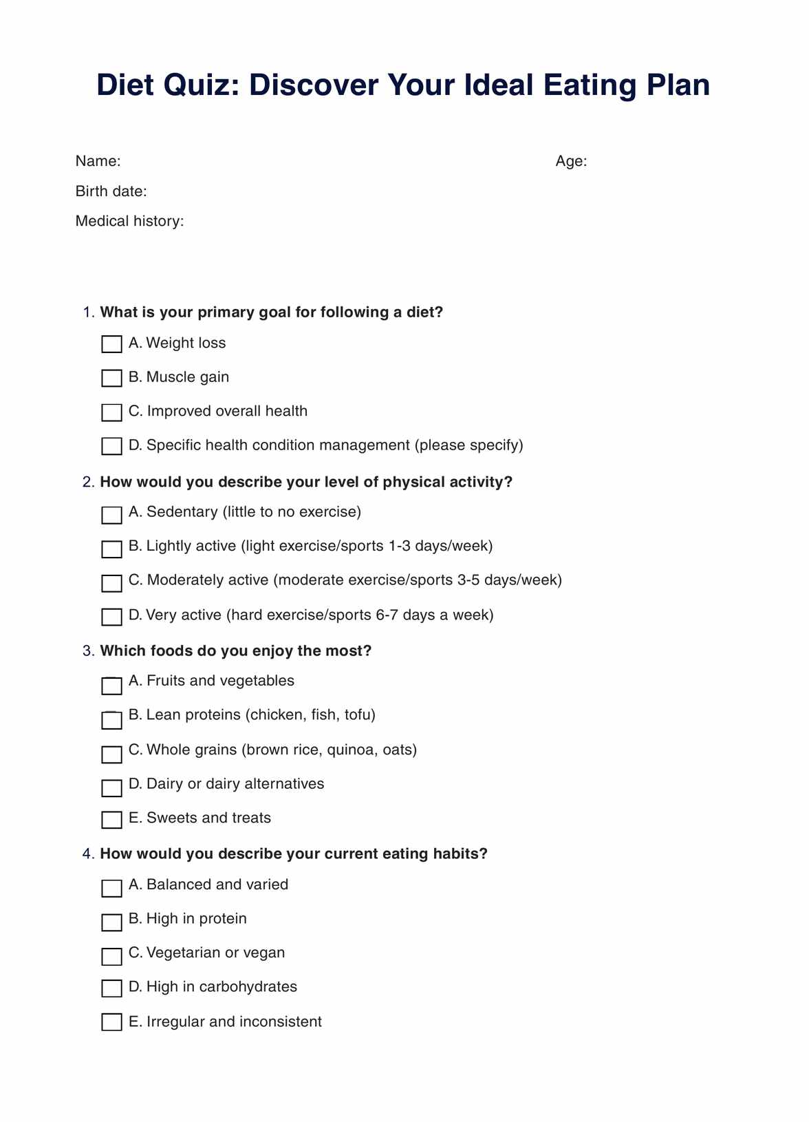 Test your knowledge of diet and nutrition with our free diet quiz! Download Carepatron's PDF for examples and answers to help you understand and improve your dietary choices.
