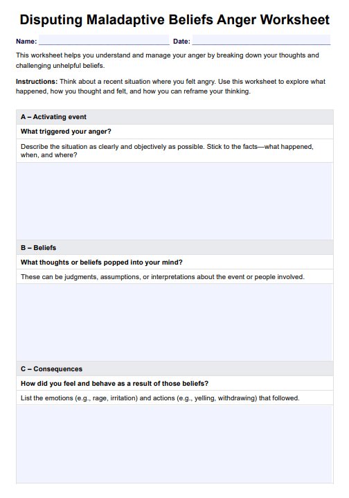 Master your emotions with the Disputing Maladaptive Beliefs Anger Worksheet. Enhance anger management through cognitive-behavioral techniques.