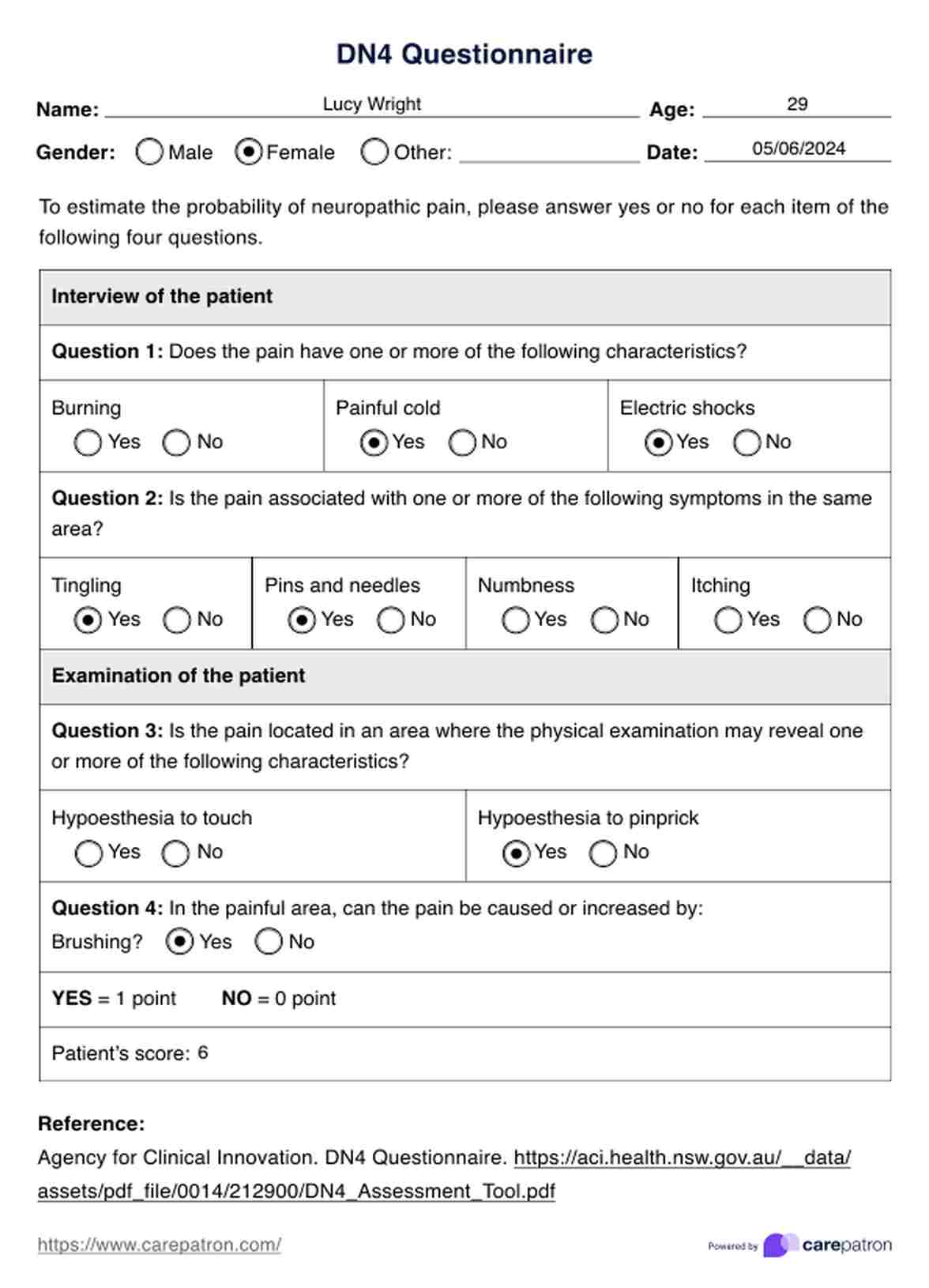 Learn about the DN4 Questionnaire, its purpose, and how to use it with Carepatron's free PDF download. Get an example questionnaire to guide you in assessing neuropathic pain.